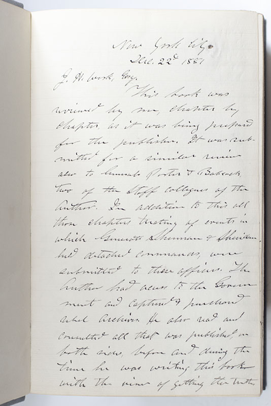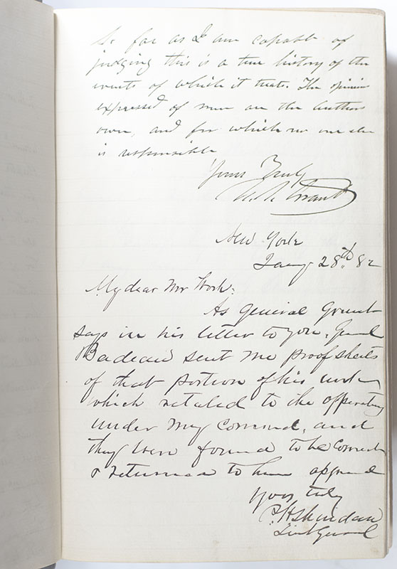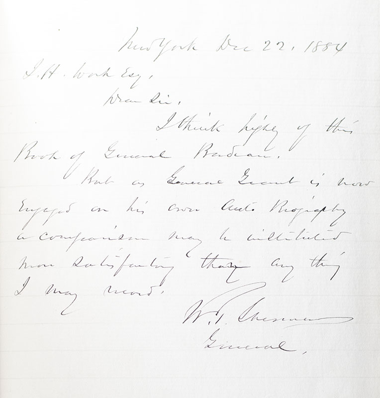 In his later work Grant in Peace (1887, chapter 51, p. 588), Badeau wrote of this very set: "Mr. Work had a copy of my Military History of Grant especially bound for his library, and asked General Grant to write something in it to attest his opinion of its merits..." The letters include an autograph letter signed by Ulysses S. Grant which reads, "New York City Dec. 22d 1881 J. H. Work, Esq., “This book was reviewed by me, chapter by chapter, as it was being prepared for the publishers. It was submitted for a similar review also to Generals Porter & Babcock, two of the staff colleagues of the Author. In addition to this all those chapters treating of events in which Generals Sherman & Sheridan held detached commands, were submitted to those officers. The Author had access to the Government and captured & purchased rebel archives. He also read and consulted all that was published, on both sides, before and during the time he was writing this book with the view of getting this truth. So far as I am capable of judging this is a true history of the events of which it treats. The opinions expressed of men are the Authors own, and for which no one is responsible. Yours truly, U.S. Grant”; an autograph note signed on the same page directly below Grant's in the hand of General Philip H. Sheridan which reads, "New York January 28th 82 My dear Mr. Work: As General Grant says in his letter to you, General Badeau sent me proof sheets of that portion of his work which related to the opperating [sic] under my command, and they were found to be correct & returned to him approved Yours truly P.H. Sheridan Lieut General”; and an autograph letter signed by General William Tecumseh Sherman which reads, "New York Dec. 22, 1884 J. H. Work Esq. Dear Sir, I think highly of this book of General Badeau. But as General Grant is now engaged on his own Auto Biography a comparison may be more satisfactory than any thing I may record. W.T. Sherman General."