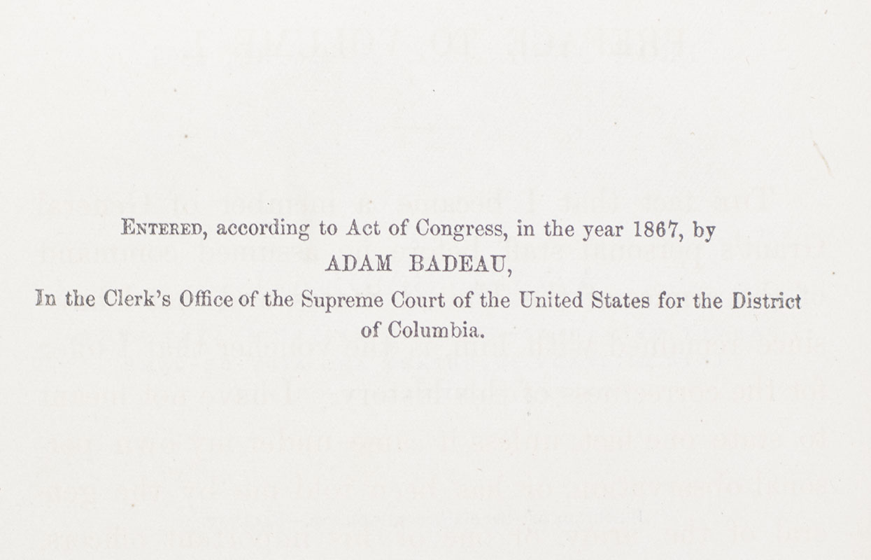 American Union Army officer Adam Badeau's abilities a writer led him to prominence within the ranks first as a staff officer for Thomas W. Sherman, and later for Ulysses S. Grant. Though Badeau’s admiration for Grant might suggest a lack of objectivity, historians have noted that “Badeau’s style is matter of fact without the embellishment or glorification typical of some early works. The accuracy is impressive… The author does not digress or reflect on matters, so the volumes have a technical precision that is both valuable for its truthfulness… and for delivering an eyewitness estimation of Grant’s performance during the war” (Eicher 486). First published between 1868 and 1881, this work has become particularly valuable for its first-hand accounts of the 1864 campaigns and the surrender at Appomattox.
