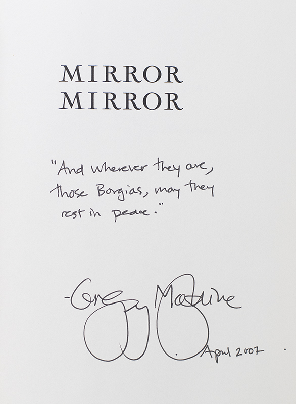 "And wherever they are, those Borgias, may they rest in peace": First edition of Gregory Maguire's Mirror Mirror; inscribed by him