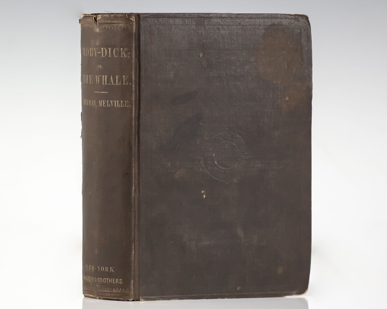 First edition, first issue binding of Melville's masterpiece. Octavo, original cloth (BAL's A grain), covers stamped in blind with Harper's circular device at the center of the front panel within a heavy blind ruled frame, orange-coated endpapers. In very good condition with light rubbing to the extremities, some foxing as usual, bookplate of Henry B. Curtis to the front pastedown with the signature of H.L. Curtis above it, large bookplate of Richard Bayard Dominic now detached with adhesive remnants to the front free endpaper, presentation inscription in pencil to the front free fly-leaf from M. A. Holland to Henry L. Curtis dated October 23rd 1853. Housed in a custom half morocco clamshell and chemise box made in the 1930s. A completely unrestored example of this great American novel.
