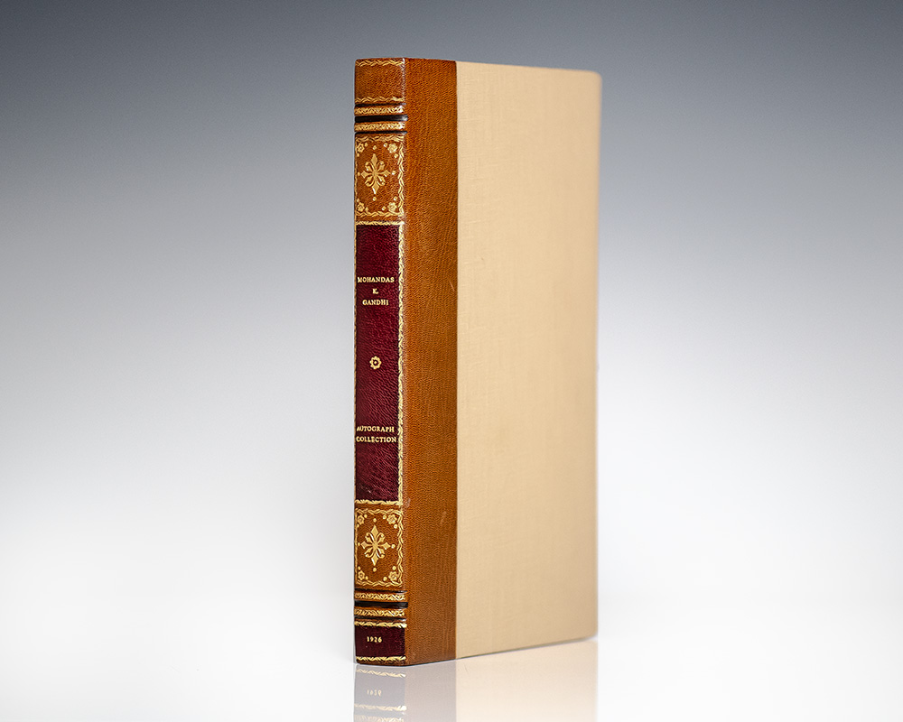 Rare autograph note collection in the hand of the Father of the Nation of India, Mahatma Gandhi, written at the height of the struggle for Indian Independence. The collection includes two autograph notes, two autograph letters, and three autograph postcards with Gandhi's "Blessings" inscribed at the conclusion of each. The postcards are postmarked May 27, June 26, and July 25 1926. Gandhi took leadership of the Indian National Congress in 1921 and led nationwide campaigns to ease poverty, expand women’s rights, and, above all, achieve Indian independence from British rule. In the wake of World War II, Gandhi opposed providing any help to the British war effort and campaigned against any Indian participation in the war. As the war progressed, Gandhi intensified his demand for independence, calling for the British to Quit India in a 1942 speech in Mumbai, hours after which he was arrested by the British government. Gandhi’s imprisonment lasted two years, although he was initially sentenced to six. He was released in May of 1944 due to failing health. Following the end of WWII, the new British government passed the Indian Independence Act of 1947, partitioning the British Indian Empire was into two dominions, a Hindu-majority India and Muslim-majority Pakistan. In very good condition. Housed in a custom half morocco clamshell and chemise box.