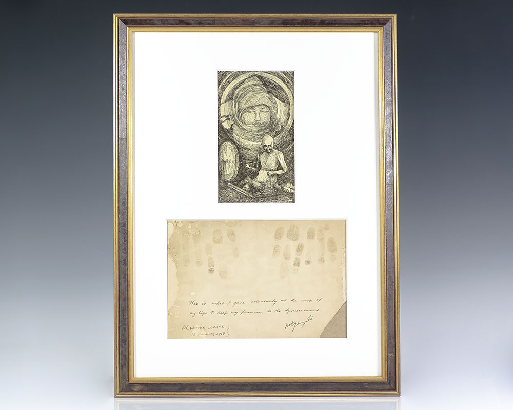Early 20th century South African government document containing the fingerprints of Mohandas K. Gandhi, signed and inscribed by him, "This is what I gave voluntarily at the risk of my life to keep my promise to the Government. Phoenix, Natal, 15th February 1909, M.K. Gandhi." In April 1893, Gandhi aged 23, set sail for South Africa to practice law in the colony of Natal, which, like India was part of the British Empire. The racial discrimination he experienced in his first year of residence inspired him to found the Natal Indian Congress which opposed several proposed discriminatory legislations and molded the Indian community of South Africa into a unified political force. One of the NIC's notable efforts was organizing public resistance to the South African government's mandatory fingerprinting of Indian South African residents in 1907 and 1908. Gandhi was repeatedly arrested and imprisoned for refusing to submit to fingerprinting, both of himself and other Indians. In October 1908, during a trip to the Transvaal, Gandhi refused to produce a registration certificate or other means of identity to officials at the Natal-Transvaal border, and was charged under section 9 of the Asiatic Registration Amendment Act, a law which had only been in force since September 21st 1908. Gandhi used his appearance in court to explain his reasons for leading resistance to the Asiatic Registration Act and the related Asiatic Registration Amendment Act. He was sentenced to two months in prison, but was released when he agreed to the voluntary registration recorded in the present document. Matted and framed. An exceptionally rare piece of history from Gandhi's formative years as a nonviolent activist, the only known example of Mahatma Gandhi's fingerprints.
