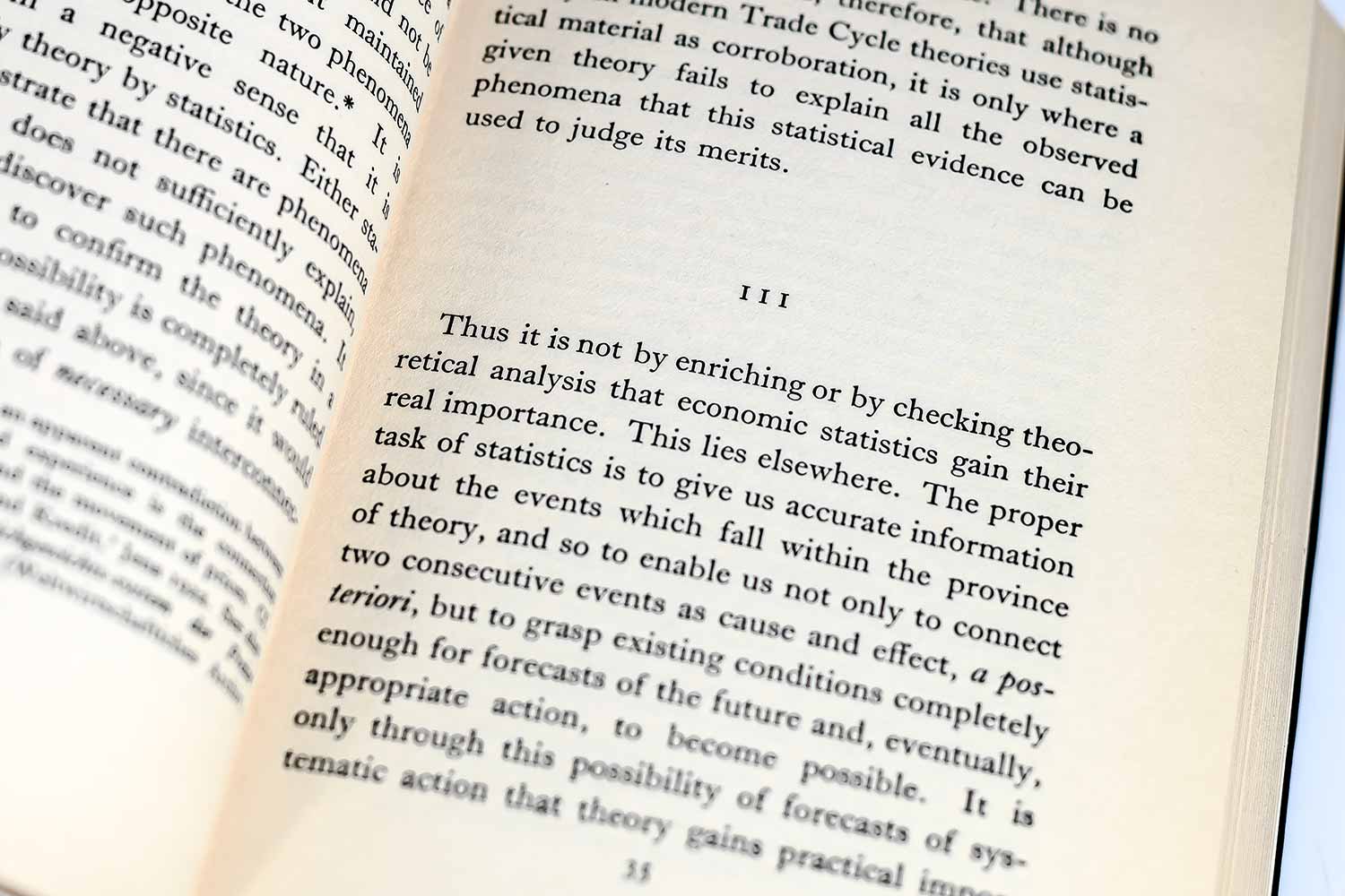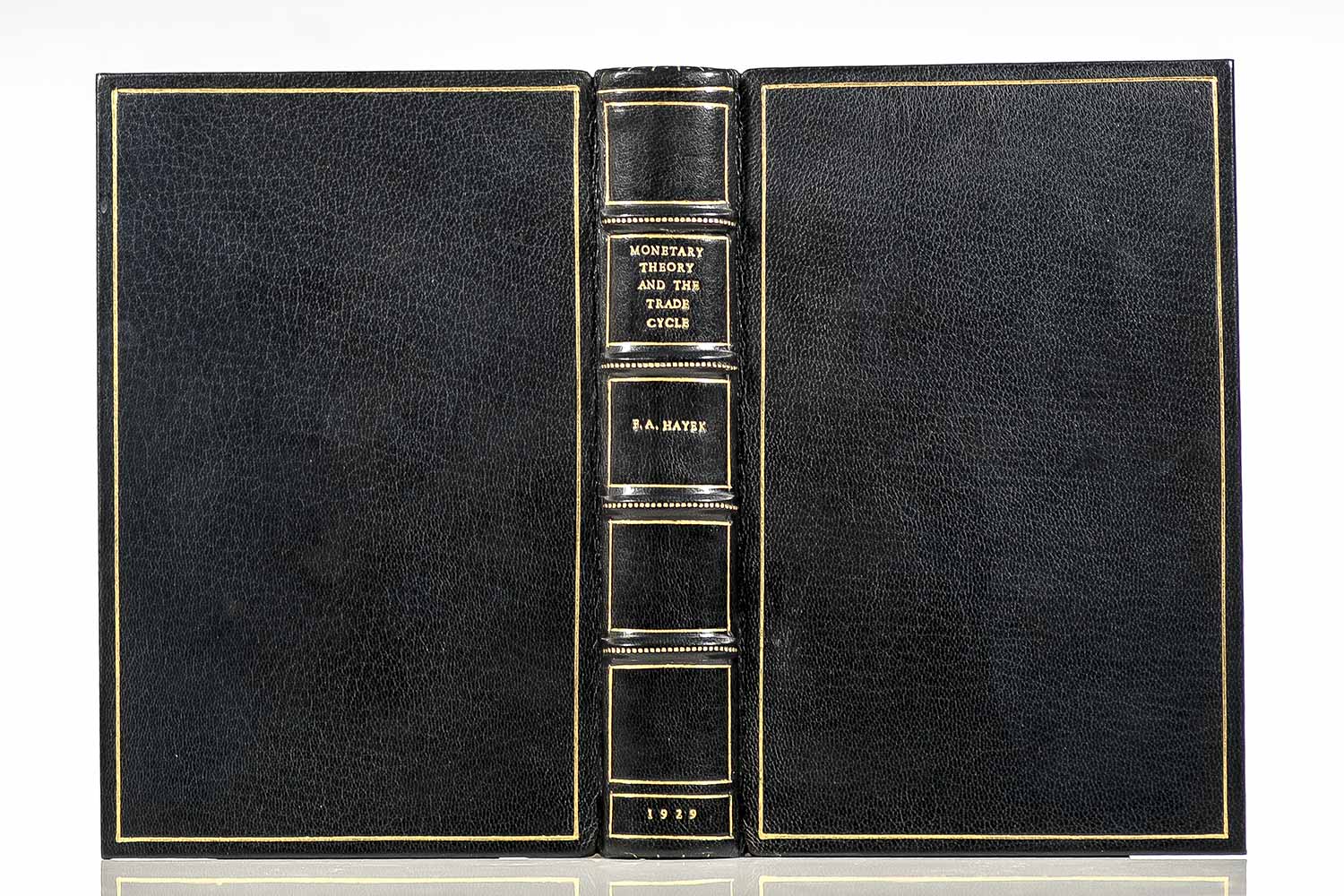 First edition in English of this early classic work by the Nobel Prize-winning economist. Octavo, bound in full morocco by the Harcourt bindery, gilt titles and tooling to the spine in six compartments within raised gilt bands, gilt ruling to the front and rear panels, gilt inner dentelles stamp-signed by the Harcourt Bindery, marbled endpapers, all edges gilt. Translated from the German by N. Kaldor and H.M. Croome. In fine condition.