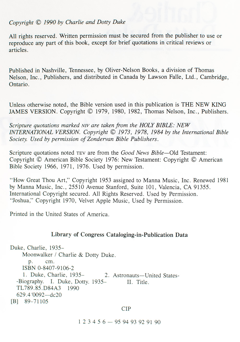 "In the controversial style of the traditional American storyteller, Charlie Duke relates the journeys of his life... Readers relive the exciting sequence of events that make up Apollo 16 as Charlie colors the technical story with vivid emotion" (Edward O. Buckbee).