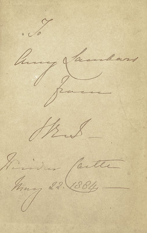Early printing of this collection of excerpts from Queen Victoria's journals from Balmoral. Octavo, original green cloth with gilt titles and decorations to the spine and front panel, patterned endpapers, illustrated with engravings. Presentation copy, inscribed by Queen Victoria on the front free endpaper, "To Amy Lambart from VRI Windsor Castle May 22, 1884." The recipient, Amy Lambart was Maid of Honour to the Queen from 1877 to 1884. In near fine condition with light rubbing to the crown and foot of the spine. Rare and desirable with noted provenance.