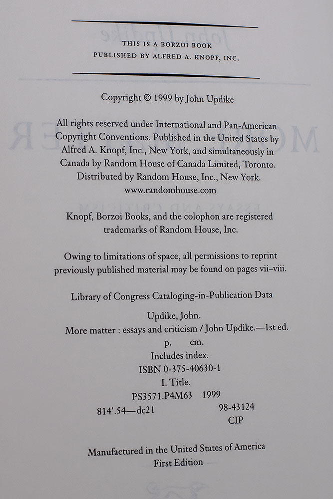 John Updike's fiftieth book and fifth collection of assorted prose, most of it first published in The New Yorker, brings together eight years' worth of essays, criticism, addresses, introductions, humorous feuilletons, and -- in a concluding section, "Personal Matters" -- paragraphs on himself and his work. More matter, indeed, in an age which, his introduction states, wants "real stuff -- the dirt, the nitty gritty -- and not . . . the obliquities and tenuosities of fiction."