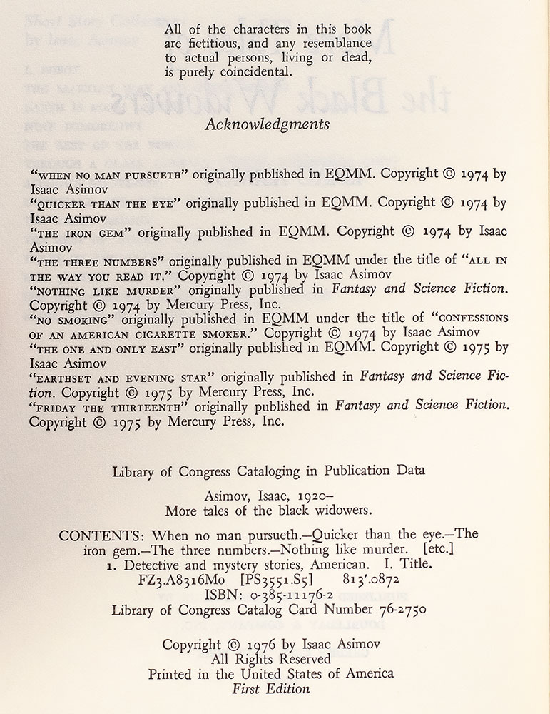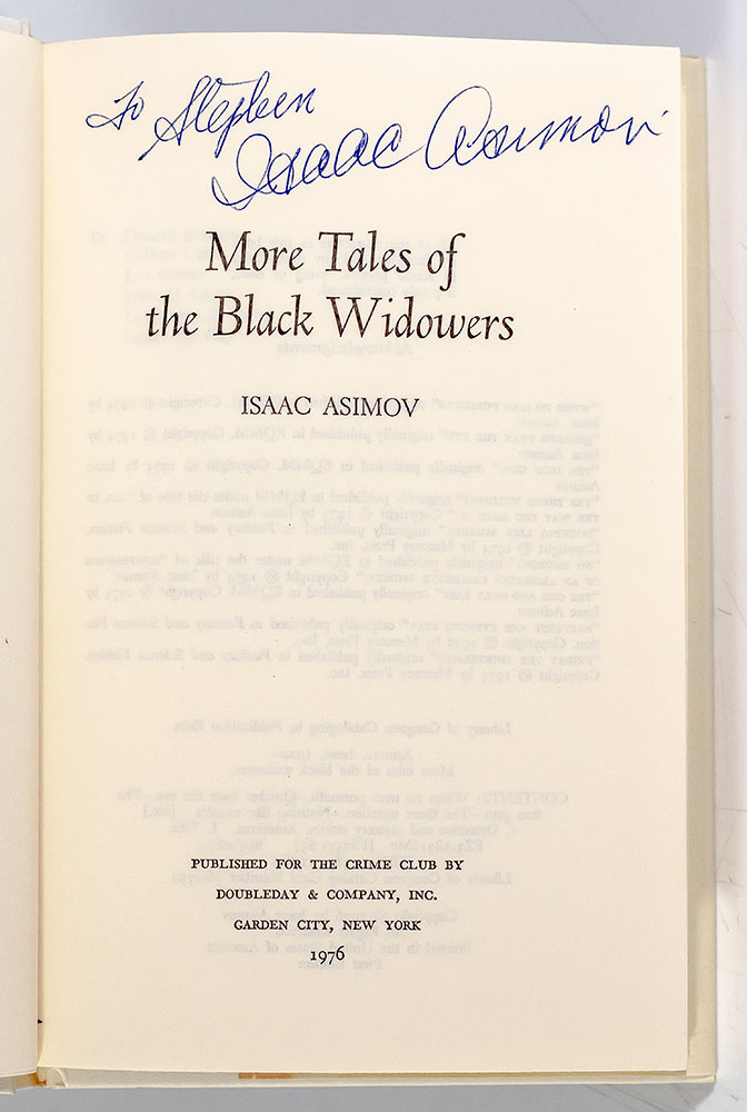 First edition of the second book in Asimov's Black Widowers series. Octavo, original boards. Presentation copy, inscribed by the author on the title page, "To Stephen Isaac Asimov." Fine in a fine dust jacket. Jacket design by Lawrence Ratzkin.