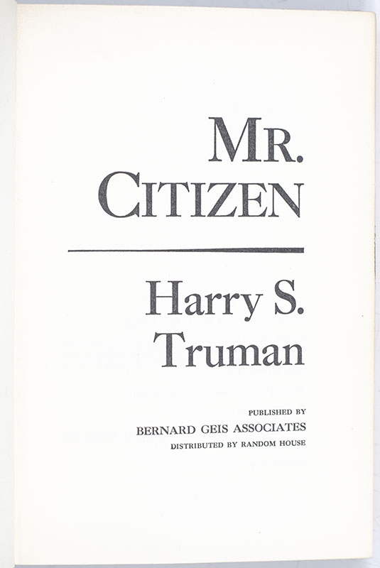 "Mr. Citizen" is a collection of articles written by President Truman after leaving the White House. "Truman belongs in the company of our great Presidents" (New York Times).