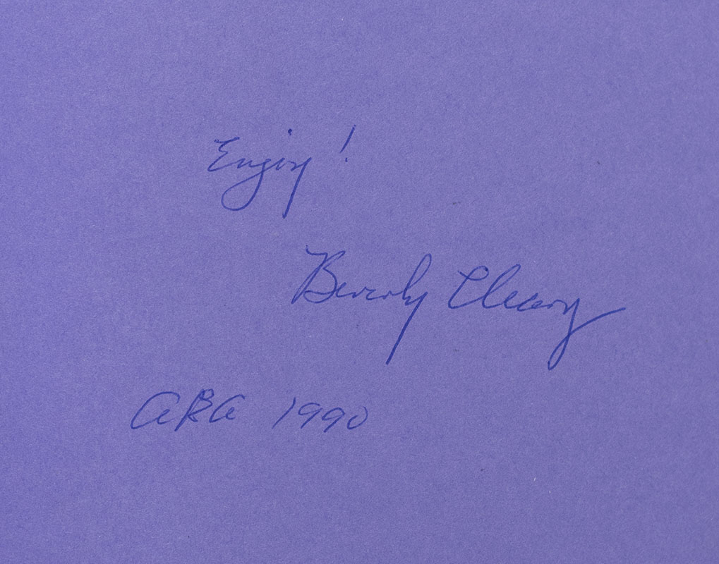 First edition of the story of Maggie Schultz, an eight-year-old girl who refuses to learn cursive. Octavo, original boards. Illustrated by Kay Life. Signed by the author on the front free endpaper in the year of publication, "Enjoy! Beverly Cleary 1990." Fine in a fine dust jacket.