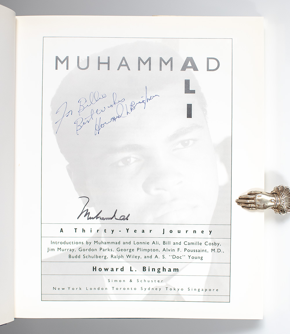 First edition of this photographic record of Muhammad Ali's career. Quarto, original cloth, illustrated with numerous photographs by Howard L. Bingham of or concerning Muhammad Ali. Boldly signed by Muhammad Ali on the title page and additionally inscribed by the photographer, "For Billie Best Wishes Howard L. Bingham." Introductions by Muhammad and Lonni Ali, Bill & Camille Cosby, Jim Murray, Gordon Parks, George Plimpton, Alvin F. Poussaint, Budd Schulberg, Ralph Wiley, and A.S. "Doc" Young. Fine in a fine dust jacket. Jacket design by Barry Littman.