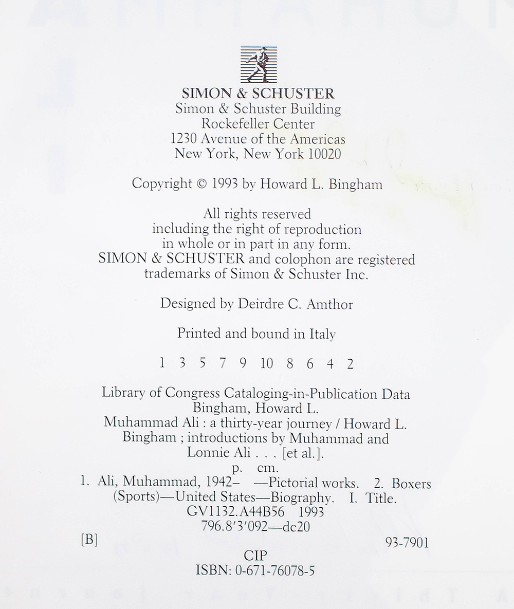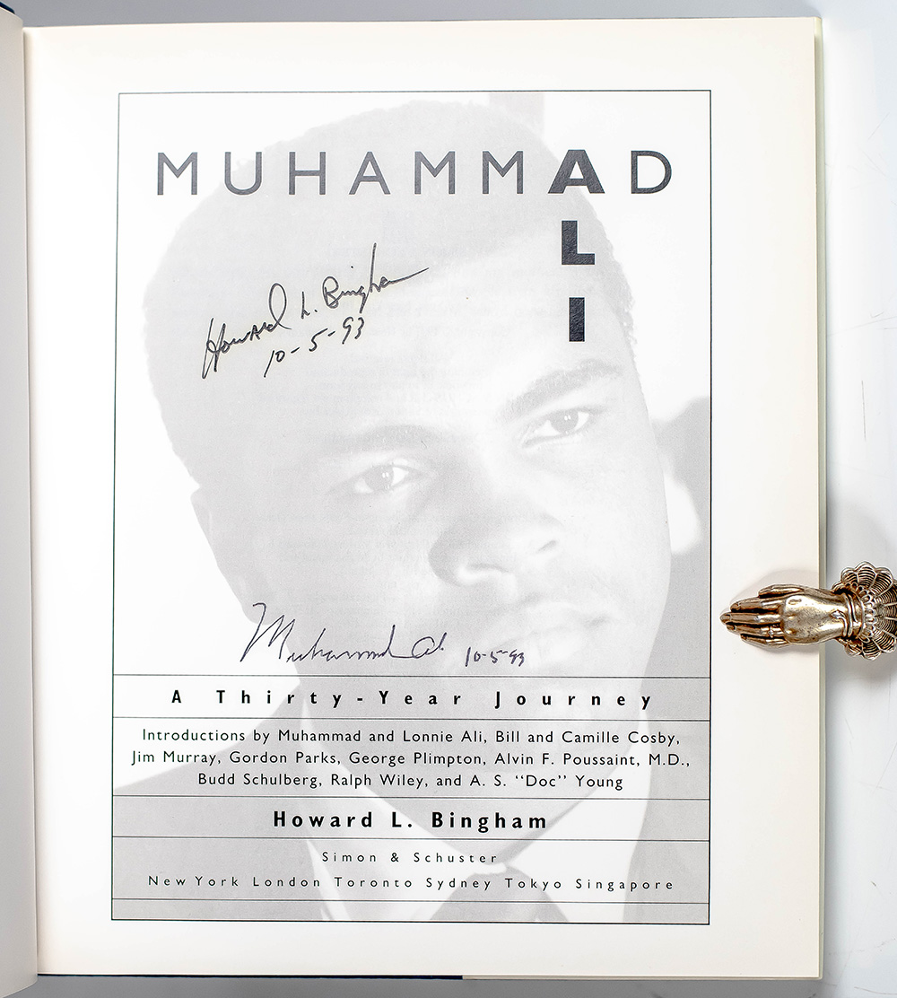 First edition of this photographic record of Muhammad Ali's career. Quarto, original cloth, illustrated with numerous photographs by Howard L. Bingham of or concerning Muhammad Ali. Signed by both Muhammad Ali and photographer Howard L. Bingham on the title page in the year of publication, "Howard L. Bingham 10-5-93" and "Muhammad Ali 10-5-93." Introductions by Muhammad and Lonni Ali, Bill & Camille Cosby, Jim Murray, Gordon Parks, George Plimpton, Alvin F. Poussaint, Budd Schulberg, Ralph Wiley, and A.S. "Doc" Young. Fine in a fine dust jacket. Jacket design by Barry Littman.