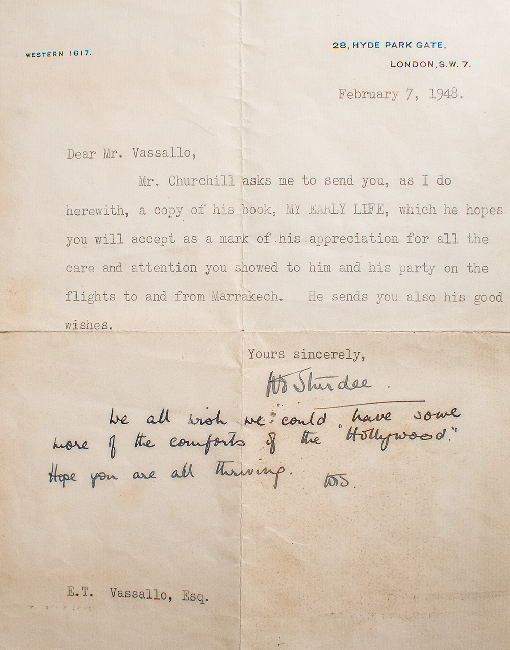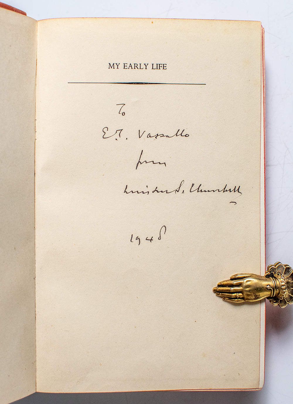 First Odhams press edition of four of Churchill's best-known works. Octavo, 4 volumes, original cloth with gilt titles and tooling to the spine, illustrated. Presentation copy, inscribed by the author on the half-title page in My Early Life, "To E.T. Vassallo from Winston S. Churchill, 1948. " With a typed letter signed by Nina Edith Sturdee, Churchill's private secretary, to the book's recipient, stating that Churchill was sending it "as a mark of appreciation for all the care and attention you showed to him and his party on the flights to and from Marrakech...", one page, 8vo, 28 Hyde Park Gate [Churchill's London residence] , 7 February 1948. Each are near fine in near fine dust jackets and housed in the original cardboard box. Rare.