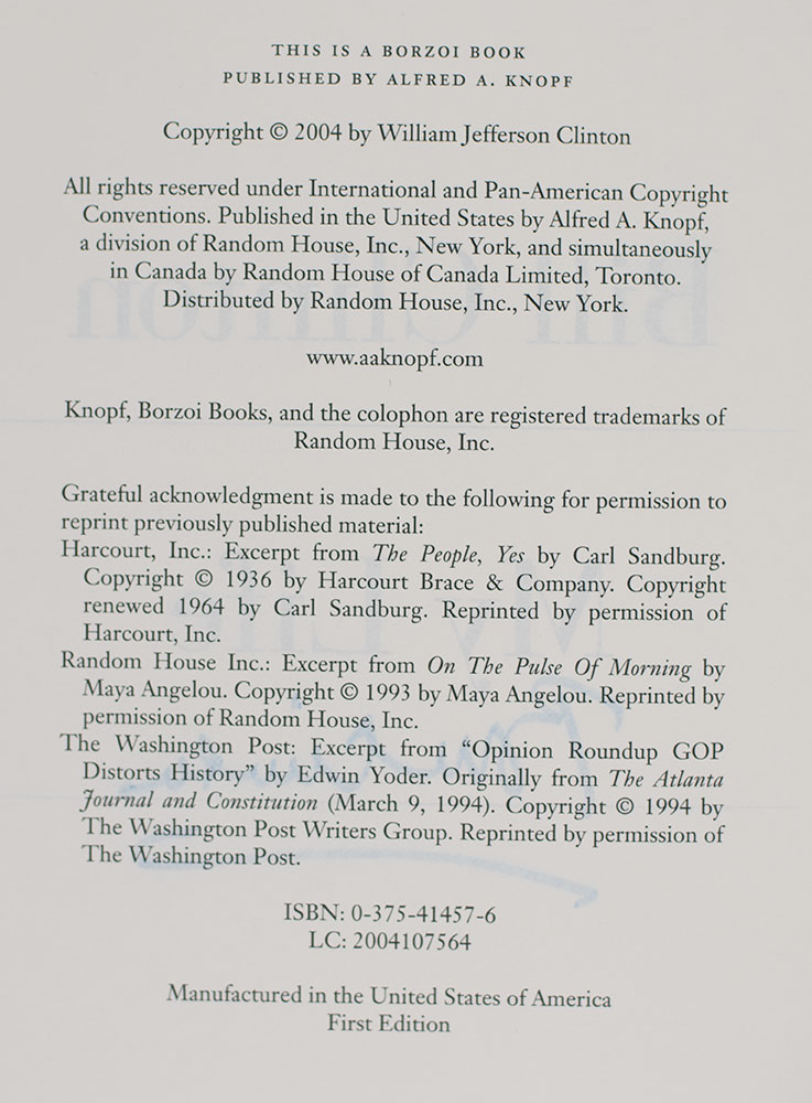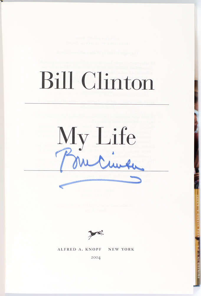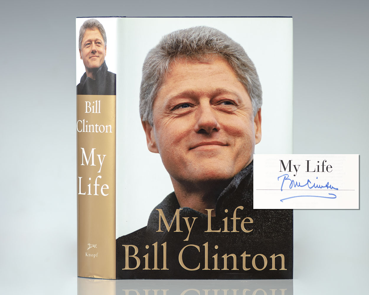 First edition of President Clinton's autobiography. Large octavo, original blue boards, illustrated. Boldly signed by Bill Clinton on the title page. Fine in a fine dust jacket. Jacket design by Carol Devine Carson.