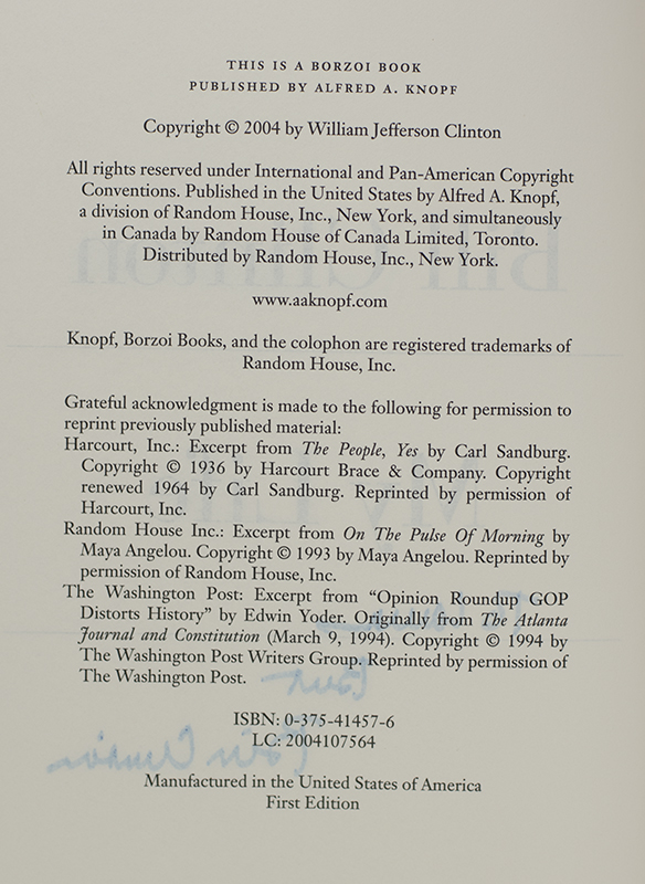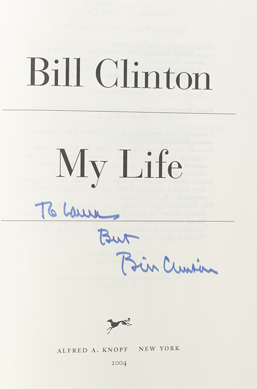 First edition of President Clinton's autobiography. Large octavo, original blue boards, illustrated. Presentation copy, inscribed by the author on the title page, "For Laura Best Bill Clinton." Fine in a fine dust jacket. Jacket design by Carol Devine Carson.