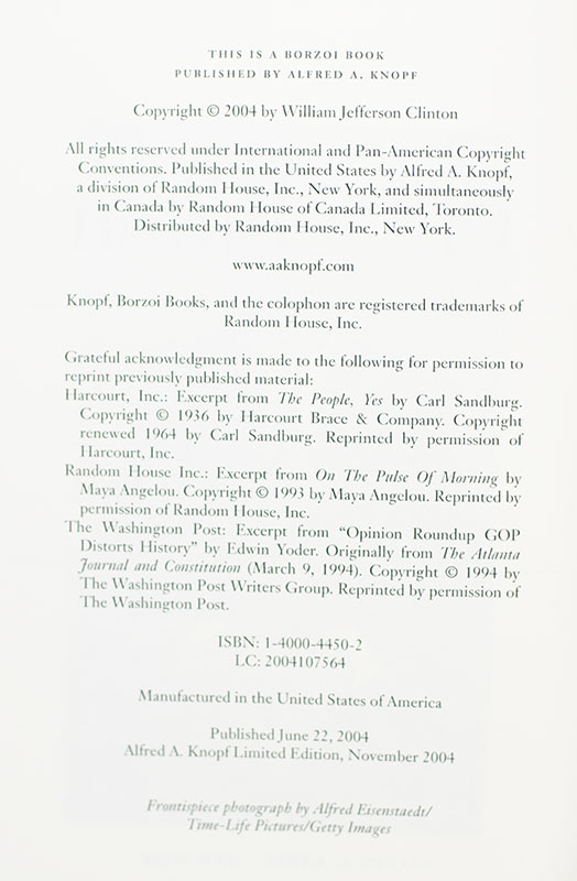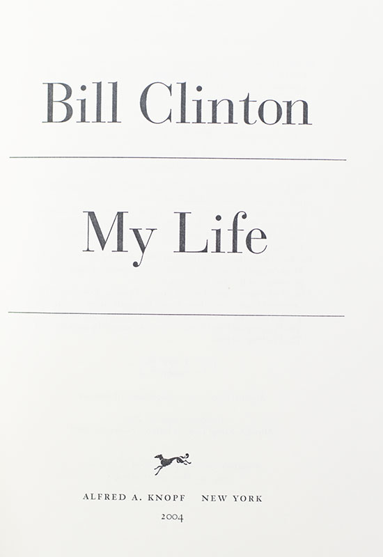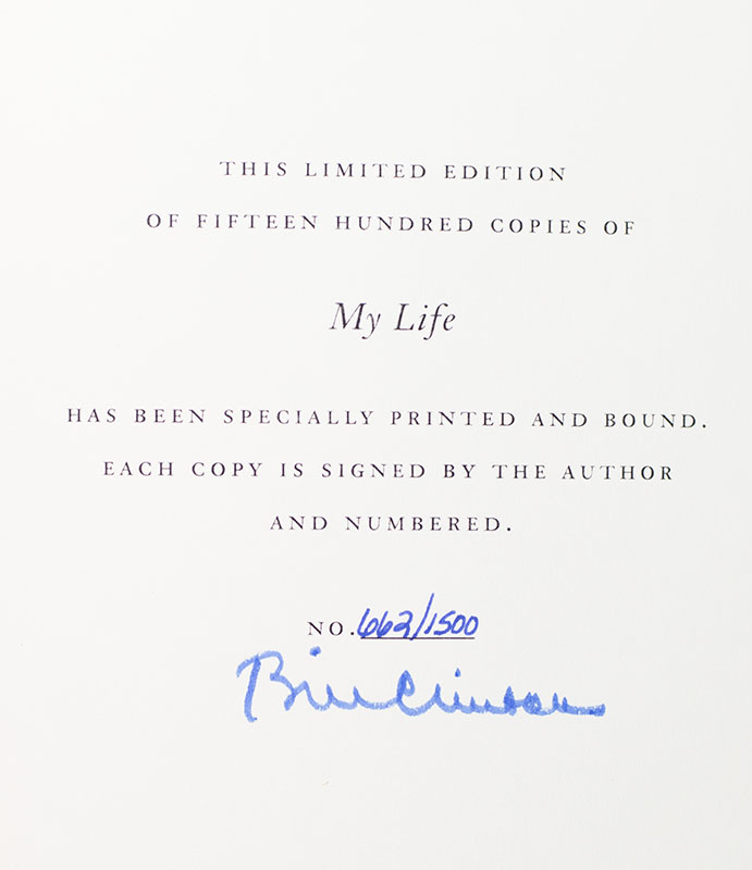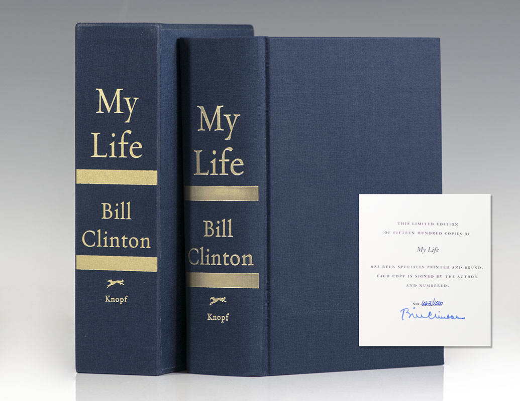 Signed limited edition of President William Jefferson Clinton's Autobiography. Thick octavo, original cloth, gilt titles to the spine, original slipcase, illustrated. Fine in a fine slipcase. Signed by Bill Clinton, one of 1500 numbered examples.