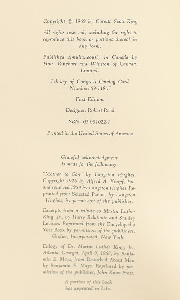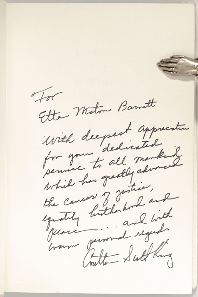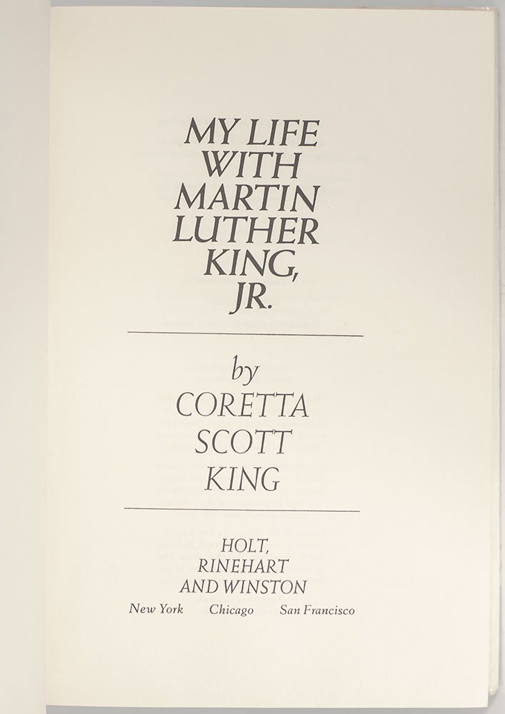 "With deepest appreciation for your dedicated service to all mankind which has greatly advanced the causes of justice, equality, brotherhood and peace"FIRST EDITION OF MY LIFE WITH MARTIN LUTHER KING, JR.; Inscribed by Coretta Scott King to Actress Etta Motten Barnett