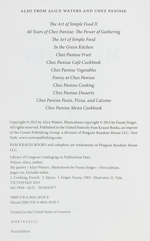 In her most intimate and compelling cookbook yet, Alice invites readers to step not into the kitchen at Chez Panisse, but into her own, sharing how she shops, stores, and prepares the pantry staples and preserves that form the core of her daily meals. Ranging from essentials like homemade chicken stock, red wine vinegar, and tomato sauce to the unique artisanal provisions that embody Alice’s unadorned yet delightful cooking style, she shows how she injects even simple meals with nuanced flavor and seasonal touches year-round. From fresh cheeses to quick pickles to sweets and spirits, these often-used ingredients are, as she explains, the key to kitchen spontaneity when combined with simple grains, vegetables, and other staple items. With charming pen-and-ink illustrations by her daughter, Fanny and Alice’s warm, inviting tone, the latest book from our most influential proponent of simple, organic cooking ensures a gracious, healthy meal is always within reach.