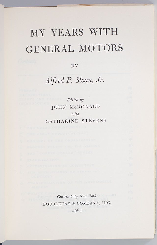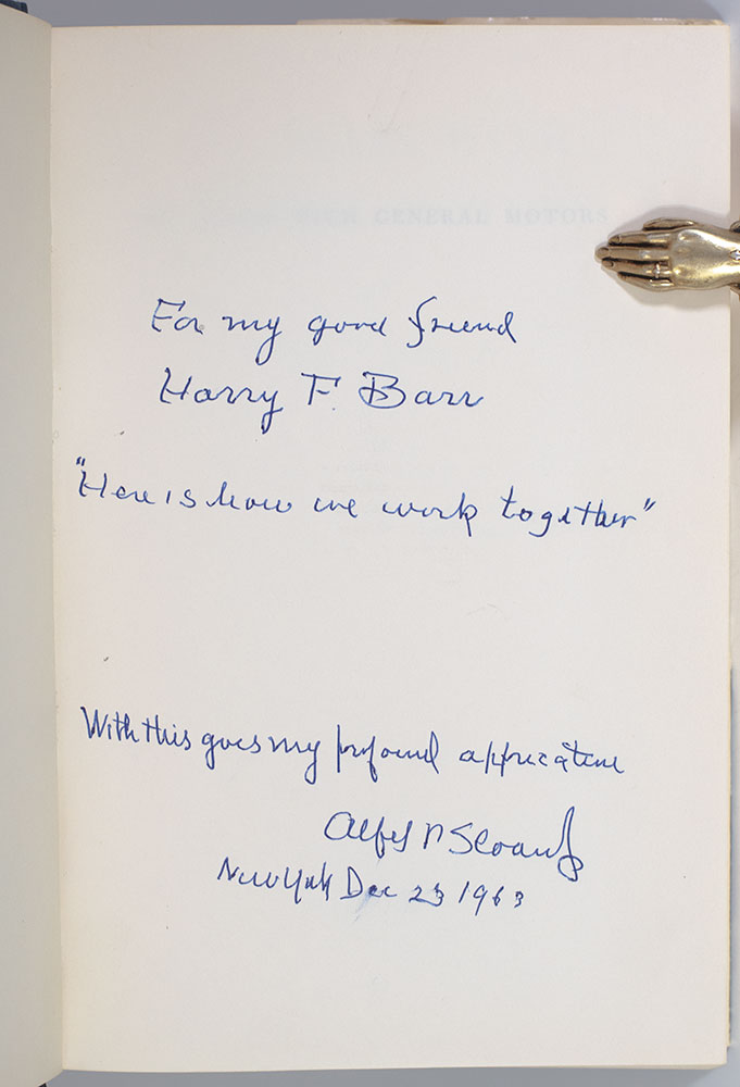 First edition of Sloan's influential work, which has since become a classic. Octavo, original cloth, illustrated. Association copy, warmly inscribed in the year of publication by the author on the half-title page, "For my good friend Harry F. Barr 'Here is how we work together' With this goes my profound appreciation Alfred P. Sloan Jr. New York Dec 23 1964." The recipient, Harry Barr was engineer, inventor, automotive industry leader, and vice-president of General Motors engineering staff and a friend of Sloan's Near fine in a near fine dust jacket. Jacket design by Lawrence Ratzkin. Jacket painting of Sloan by Robert Weaver, courtesy of Fortune Magazine. Edited by John McDonald with Catherine Stevens. First editions are uncommon, especially signed and inscribed.