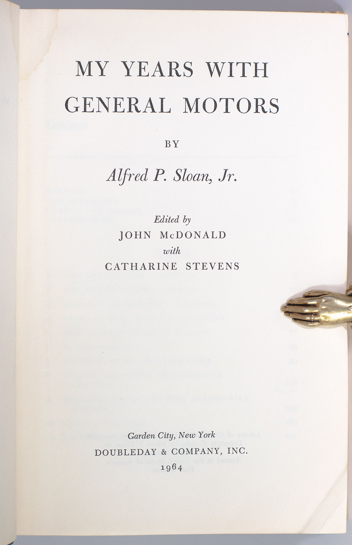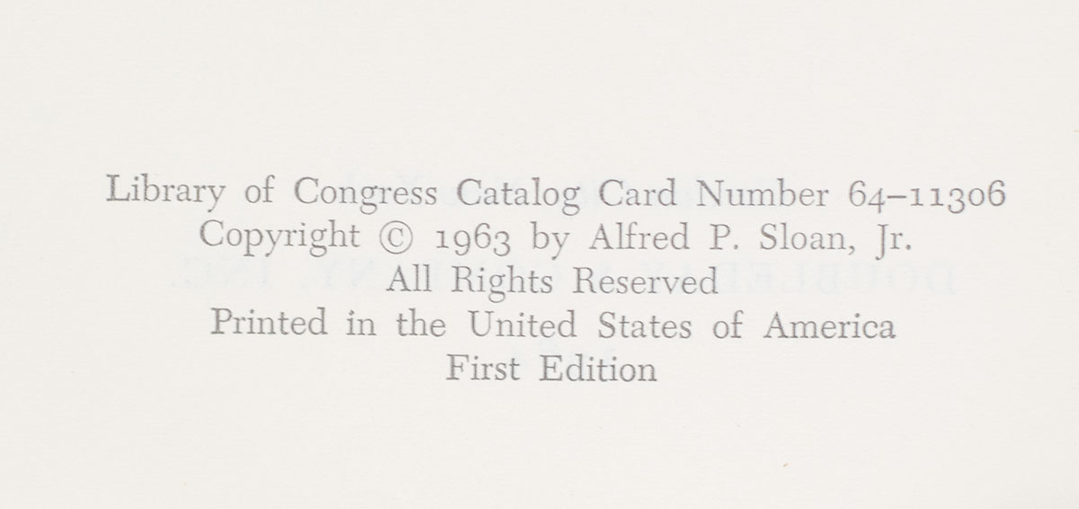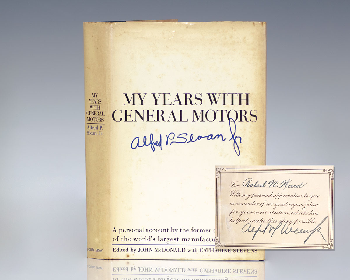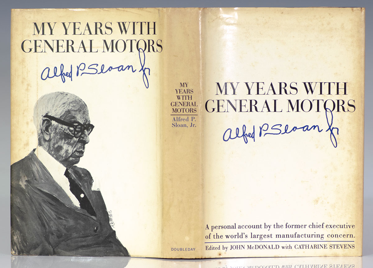 First edition of Sloan's influential work. Octavo, original cloth, illustrated. Boldly signed by Alfred P. Sloan Jr. on an bookplate to the front free endpaper. Very good in a very good dust jacket. Jacket design by Lawrence Ratzkin. Jacket painting of Sloan by Robert Weaver, courtesy of Fortune Magazine. Edited by John McDonald with Catherine Stevens. First editions are uncommon.
