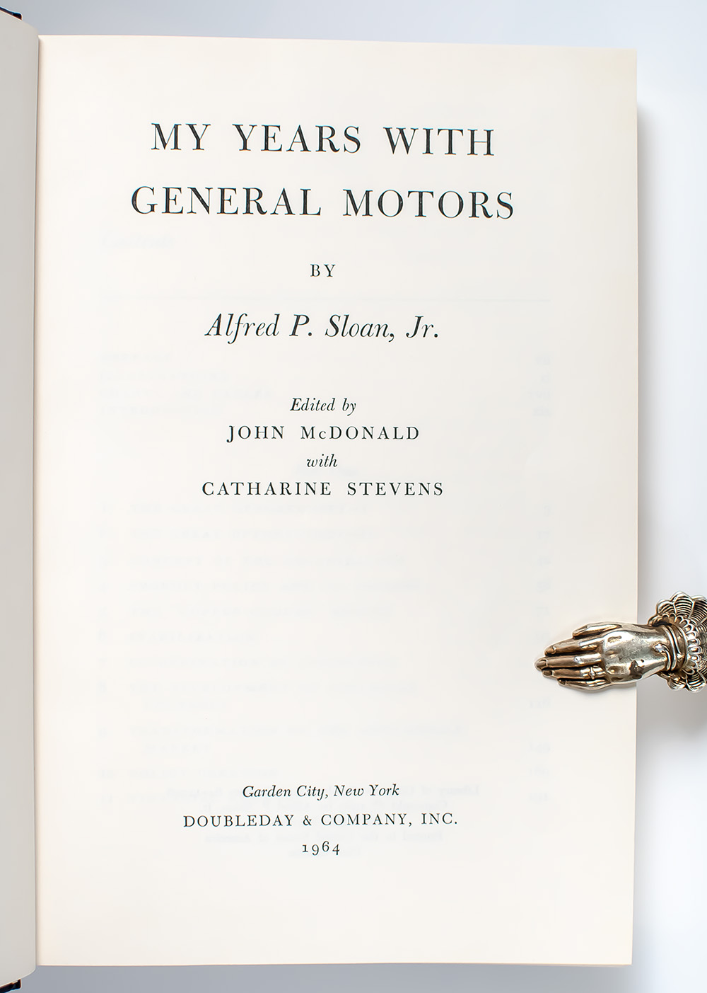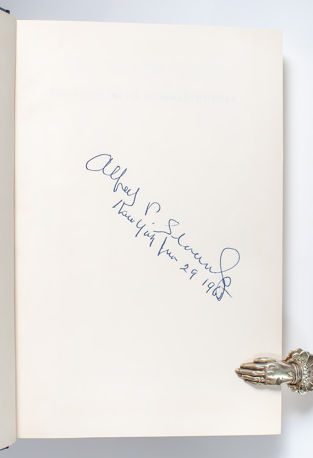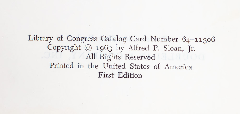 First edition of Sloan's influential work, which has since become a classic. Octavo, original cloth, illustrated. Boldly signed by the author on the page preceding the half-title page, "Alfred P. Sloan Jr. New York Jan 29, 1965." Fine in a near fine dust jacket. Jacket design by Lawrence Ratkin. Jacket painting of Sloan by Robert Weaver, courtesy of Fortune Magazine. Housed in a custom slipcase. Edited by John McDonald with Catherine Stevens. Uncommon signed.