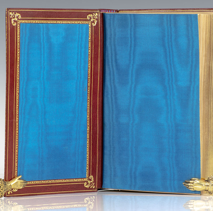 Elaborately bound Cosway style first edition in English of Emil Ludwig's biography of Napoleon Bonaparte. Octavo, bound by Bayntun-Riviere in full Cosway style scarlet morocco with gilt titles and tooling to the spine in six compartments within raised gilt bands, inset ivorene hand-painted portrait of Napoleon to the front panel, gilt fleuron corner-pieces withing double gilt ruling to the front and rear panels, all edged gilt, gilt turn-ins and inner dentelles, light blue watered silk endpapers, illustrated with engravings. In fine condition.