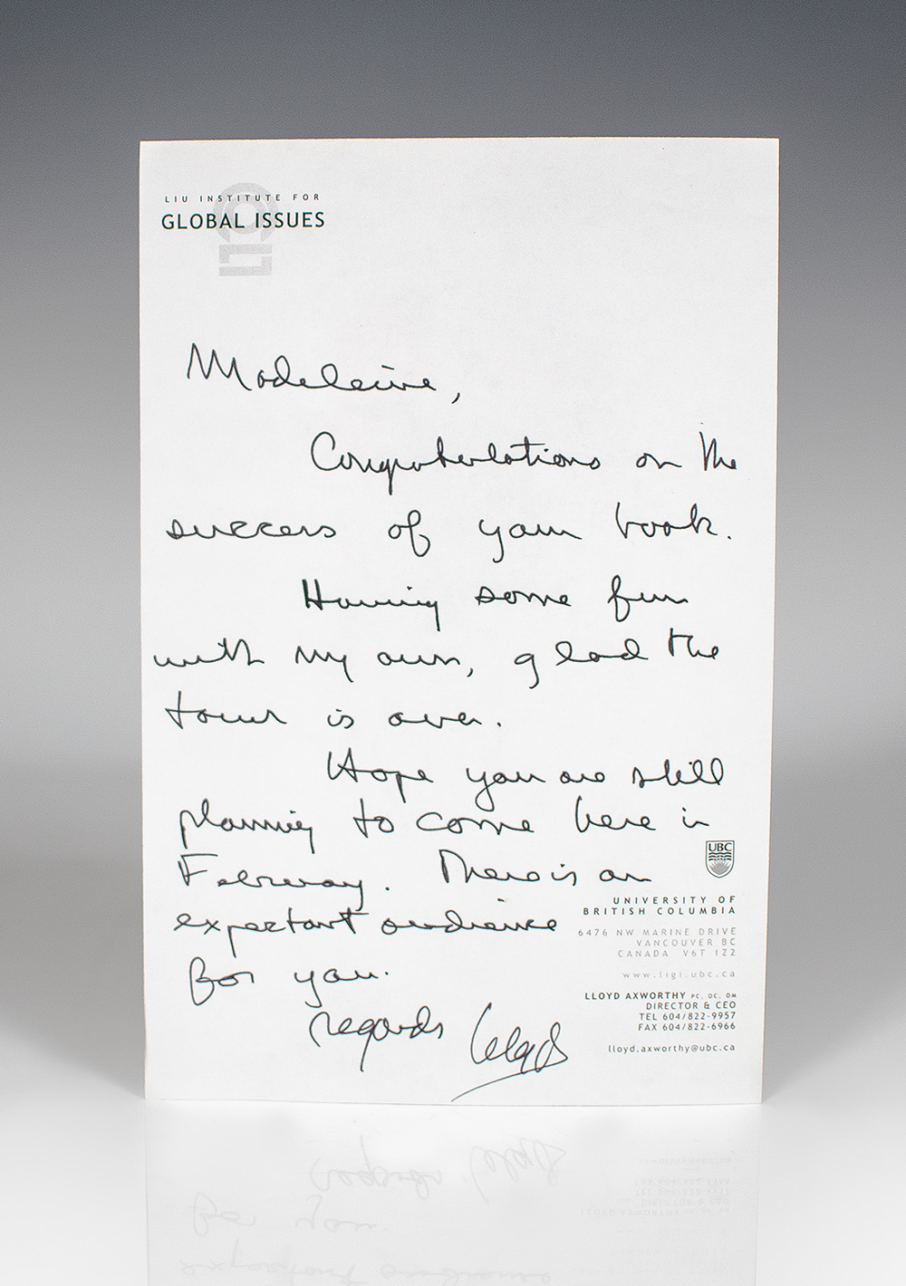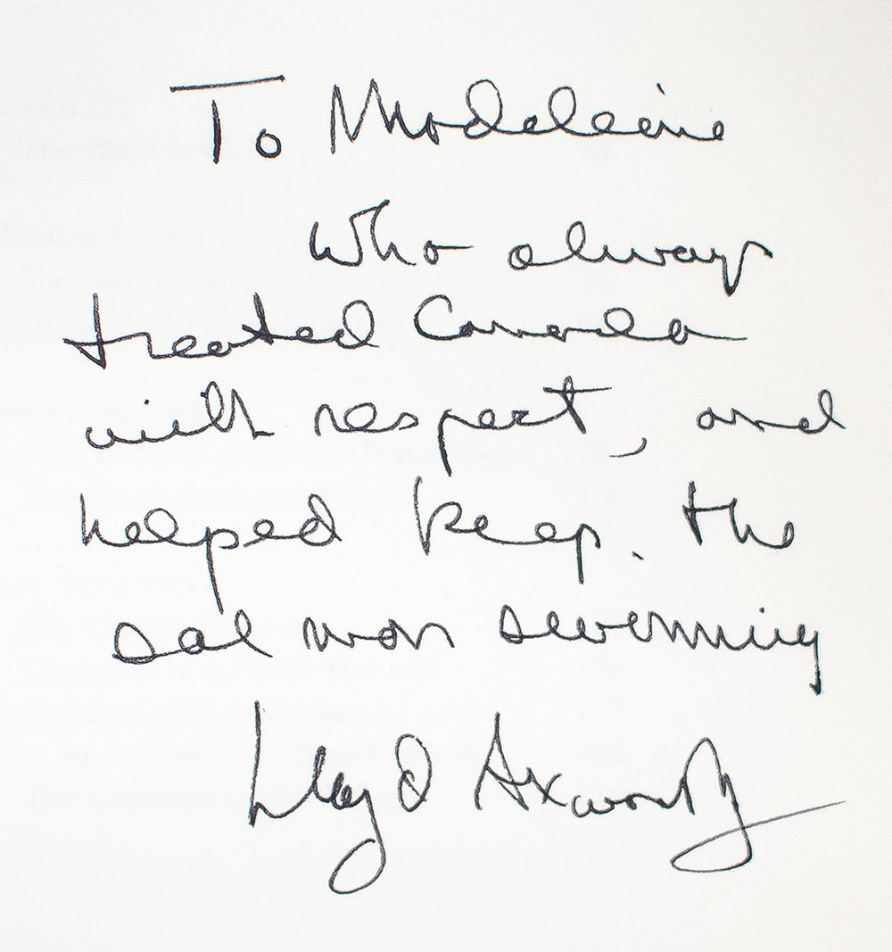 First edition of this call for action from one of Canada's most eloquent statesmen and thinkers. Octavo, original publisher's cloth. Association copy, inscribed by the author on the dedication page, "To Madeleine Who always treated Canada with respect, and helped keep the salmon swimming Lloyd Axworthy." Accompanied by an autograph letter from the author, "Madeleine, Congratulations on the success of your book. Having some fun with my own, glad the tour is over. Hope you are still planning to come here in February. There is an expectant audience for you. Regards Lloyd." The recipient, Madeleine K. Albright, was the first woman to serve as the U.S. Secretary of State. She acted under President Bill Clinton from 1997 to 2001, leading the United States through foreign policy in the Middle East with the endorsement of military action in Iraq. At the 1998 NATO summit, Albright coined the “3 Ds” of NATO, “which is no diminution of NATO, no discrimination and no duplication – because I think that we don’t need any of those three “Ds” to happen.” After her tenure as Secretary of State, she served as chair of the consulting Albright Stonebridge Group and was the Michael and Virginia Mortara Endowed Distinguished Professor in the Practice of Diplomacy at Georgetown University’s School of Foreign Service. For Albright’s contributions to foreign policy and relations that defined a century, President Barack Obama awarded her the Presidential Medal of Freedom in 2012. Albright and former Canadian Foreign Minister, Lloyd Axworthy, worked together to come to an agreement over the conservation and management of Pacific salmon between Canada and the United States. Near fine in a near fine dust jacket, bookplate of Albright to the front pastedown. Jacket design by CS Richardson.