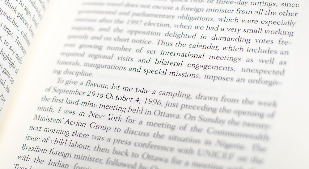 "Where is the line we draw in setting out the boundaries for being responsible for others? Is it simply family and close friends? Do we stop at the frontiers of our own country? Does our conscience, our sense of right or wrong, take us as far as the crowded camps of northern Uganda, surrounded by land mines, attacked repeatedly by an army made largely of child soldiers? I believe we in Canada have a special vocation to...help in the building of a more secure order. We need not be confined to our self-interest" (From 'Navigating a New World').