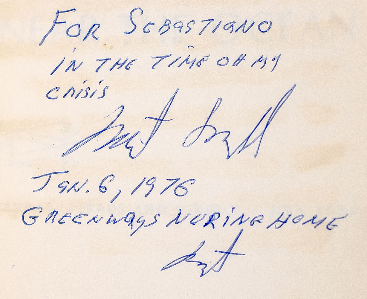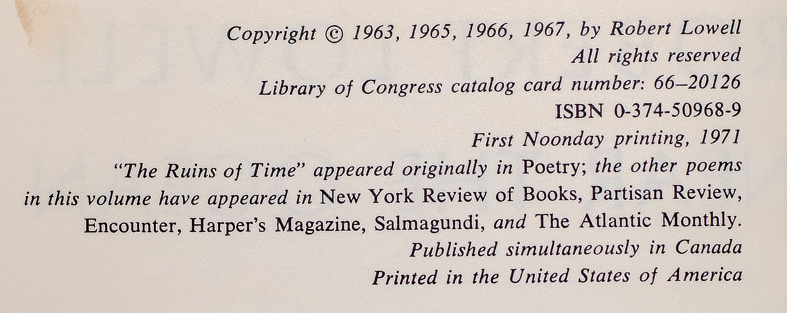 First Noonday printing of Lowell's renowned collection of poems, including his famous Waking Early on Sunday Morning. Octavo, original pictorial wrappers. Presentation copy, inscribed by the author on the half-title page, "For Sebastiano In the time of my crisis Robert Lowell Jan. 6, 1976 Greenways Nur[s]ing Home Robert." In very good condition with  a few holograph markings and notes including brief corrections on pages 35 and 40, owner's inscription covered with white paint on front inside cover. Uncommon signed and inscribed.