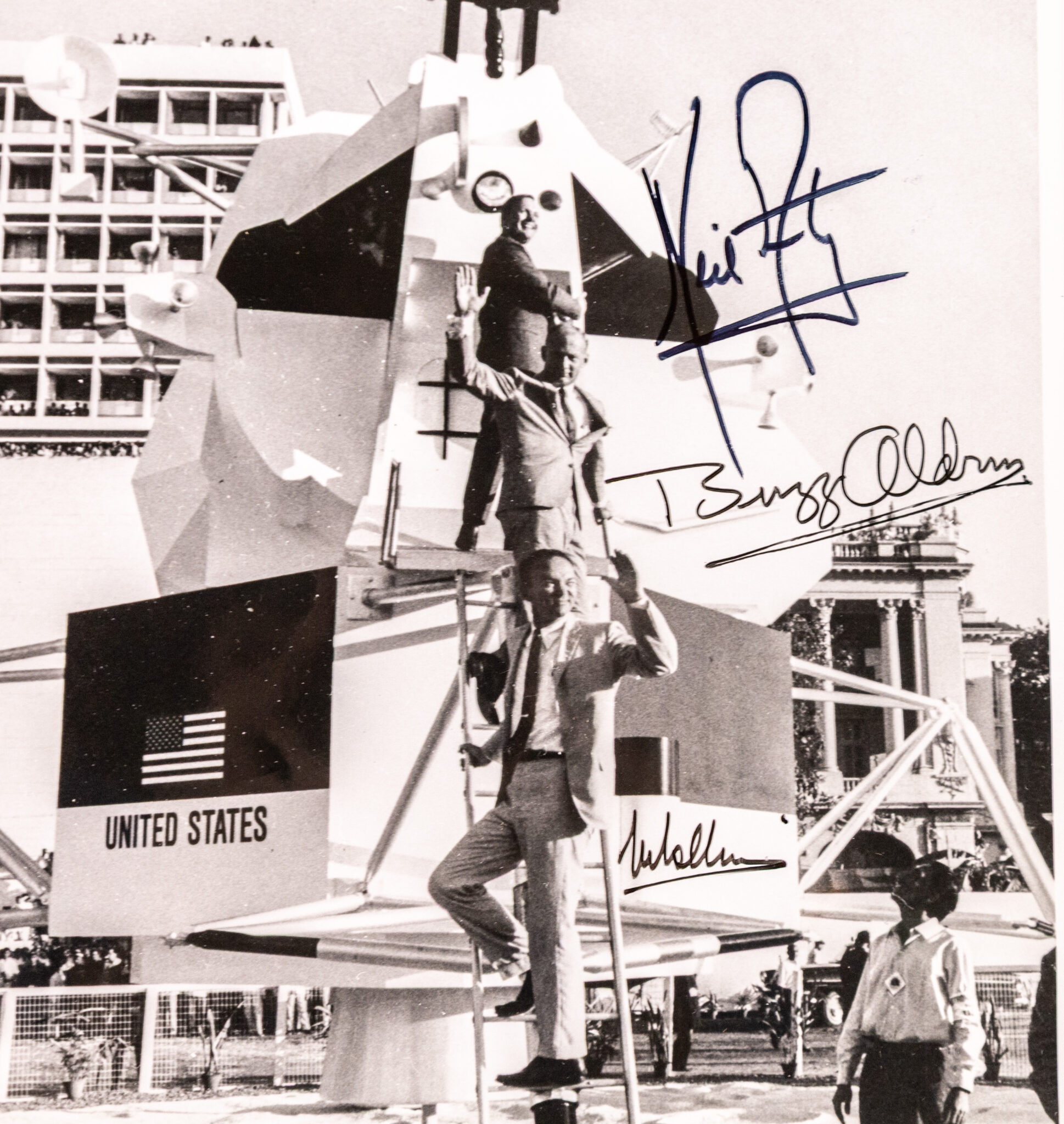 Glossy black and white photograph signed by NASA astronauts Neil Armstrong, Edwin "Buzz" Aldrin, and Michael Collins. Apollo 11 crew members Armstrong, Aldrin, and Collins are pictured waving for photographers from the Lunar Lander Ladder on Earth at an exhibit in Bombay, India, as part of the Apollo 11 "Giant Step" World Tour in 1969. Boldly signed in black felt tip by Neil Armstrong, Buzz Aldrin, and Michael Collins next to their respective images. In fine condition. Double matted and framed. The photograph measures 8 inches by 10 inches. The entire piece measures 16.25 inches by 13.25 inches.