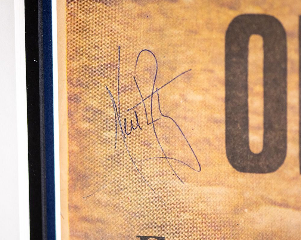 1969 Chicago Tribune with the headline “Americans on Moon! Eagle Has Landed - Armstrong." The article was commemorating the moon landing from the day before and is dated Monday, July 21, 1969. Boldly signed by Neil Armstrong in blue ink to the left of the headline. Triple matted and framed. In very good condition with wear at folds. The remainder of the newspaper and continuation of the article is housed in a pocket on the back of the frame. The entire piece measures 21.75 inches by 30.75 inches.