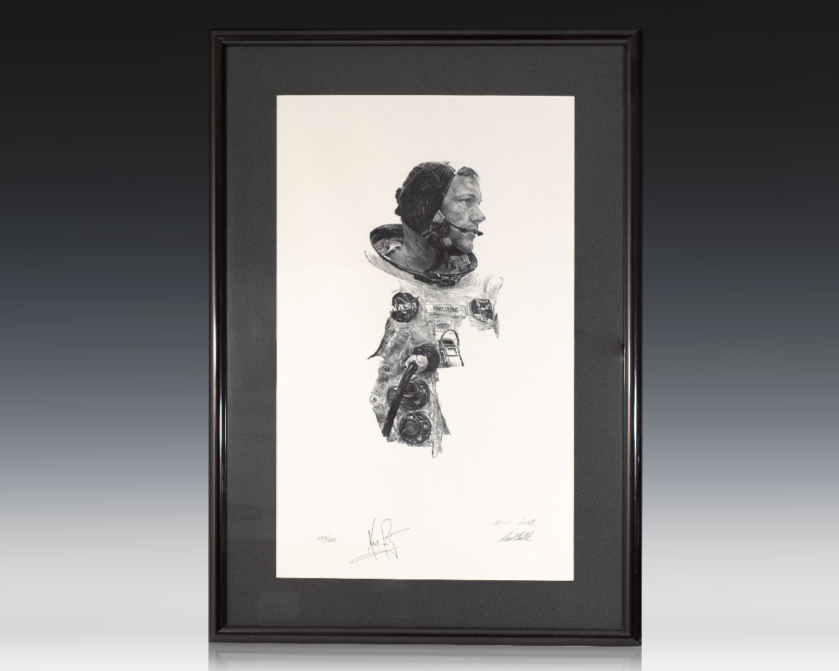 Signed limited lithographic print of Paul Calle's pencil sketch of Neil Armstrong captured as he suited up on July 16, 1969 in preparation for his launch to the moon. One of 1000 numbered copies signed by Armstrong, this is number 243. Additionally signed by Paul Calle beneath his printed facsimile signature. New York born artist Paul Calle was one of eight artists chosen by NASA in 1962 to document the U.S. space program and was the only artist present when the crew of Apollo 11 prepared to enter the spacecraft for their historic mission. Four days later Armstrong became the first human being to land a spacecraft on the moon and to set foot on the lunar surface. This limited edition of 1000 numbered copies of Calle's graphite pencil drawing was signed by both Calle and Armstrong and presented by the National Air and Space Museum of the Smithsonian Institution. All profits from the sale of the prints were donated to the Charles A. Lindbergh Memorial Fund. Calle subsequently designed the iconic "First Man on the Moon" 10-cent stamp, and in his long career he would design over 40 stamps for the U.S. Postal Service. In fine condition. Matted and framed. The lithograph measures 15 inches by 25 inches. The entire piece measures 22 inches by 32 inches. Highly desirable, being the only limited print edition that Armstrong signed which remains among the most sought-after of all NASA-related lithographs.