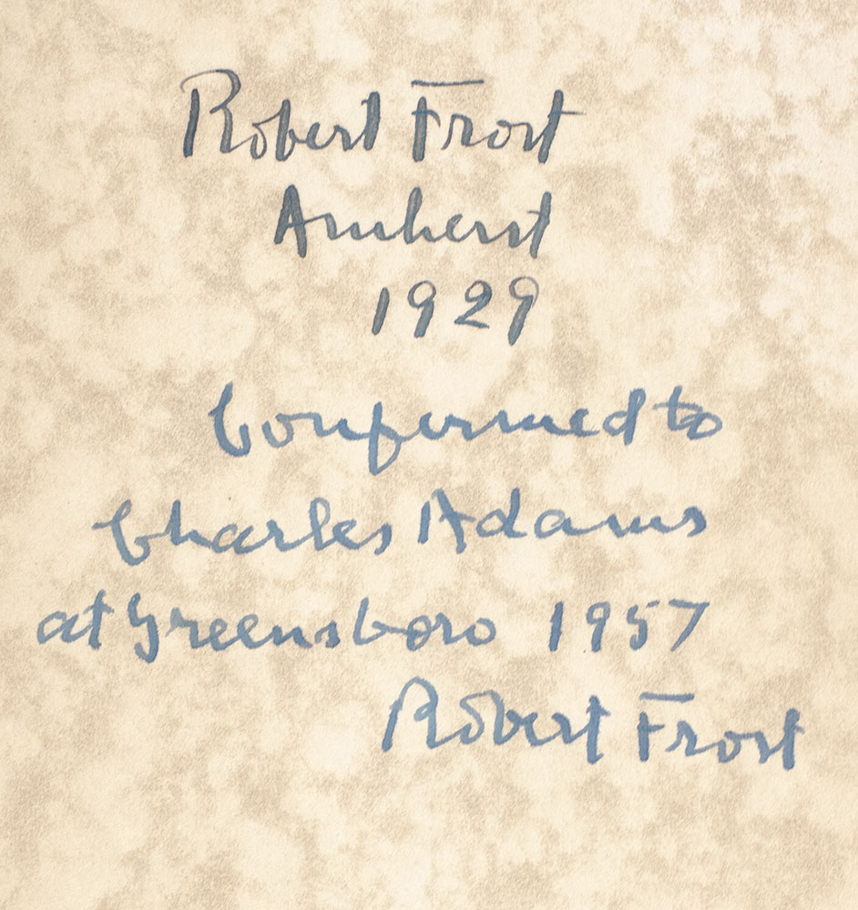 First edition, early printing of Robert Frost's first Pulitzer Prize-winning collection, signed twice by him. Octavo, original cloth, woodcuts by J.J. Lankes. Signed twice by the author on the front free endpaper, "Robert Frost Amherst 1929" and below "Confirmed to Charles Adams at Greensboro 1957 Robert Frost." In very good condition, recipient name.