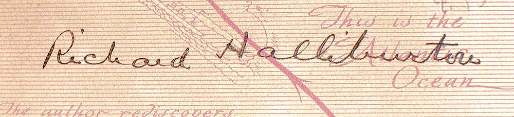 First edition of the third legendary travel-adventure book from this author. Medium octavo, original olive green cloth with gilt titles, beveled edges, cartographic endpapers, frontispiece of the author at the summit of Popocatepetl, illustrated with photographs throughout. Boldly signed by Richard Halliburton on the front free endpaper. In very good condition, owner signature to the half-title page.
