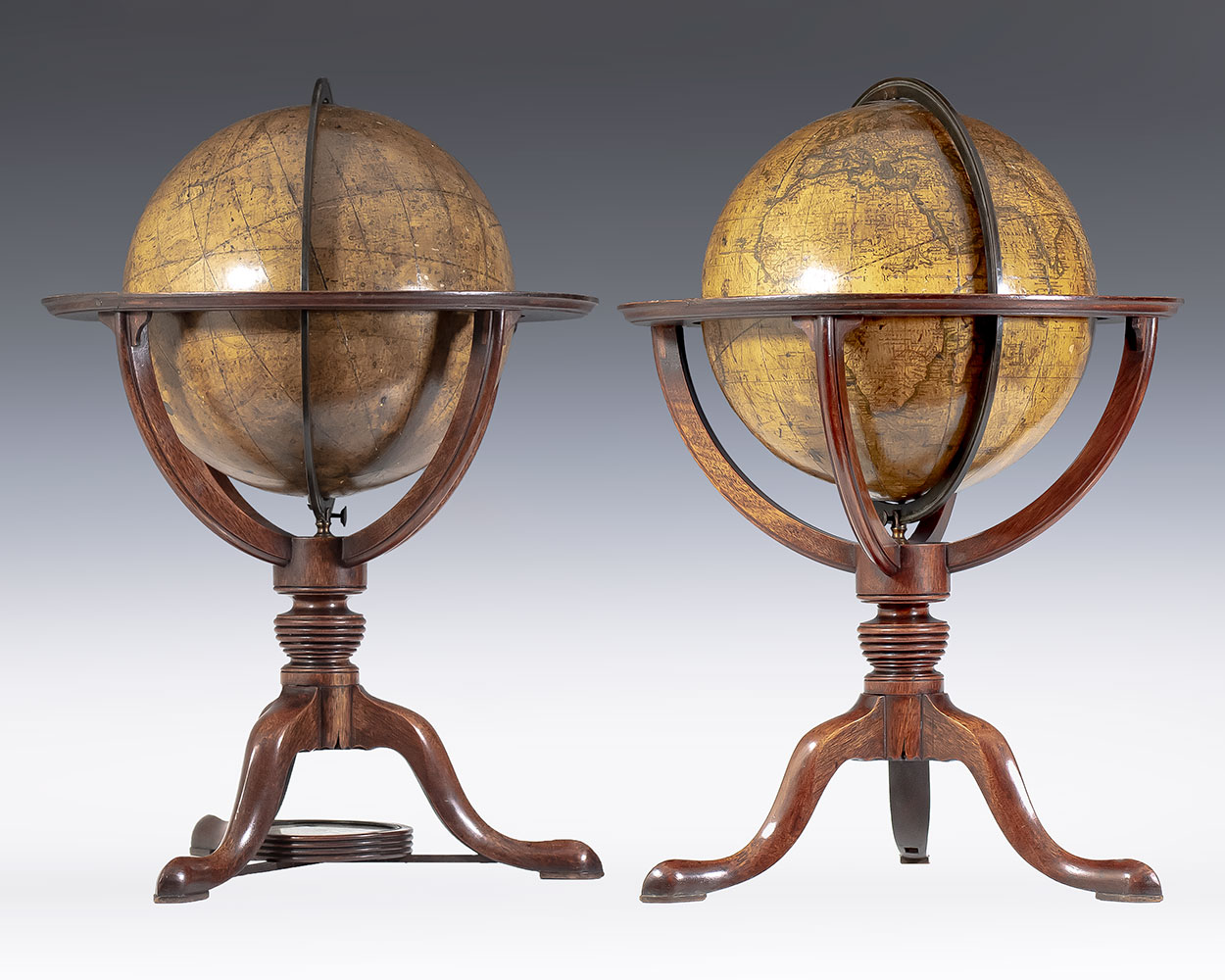Fine pair of rare early 19th century of Regency Twelve-Inch Terrestrial and Celestial Library Globes