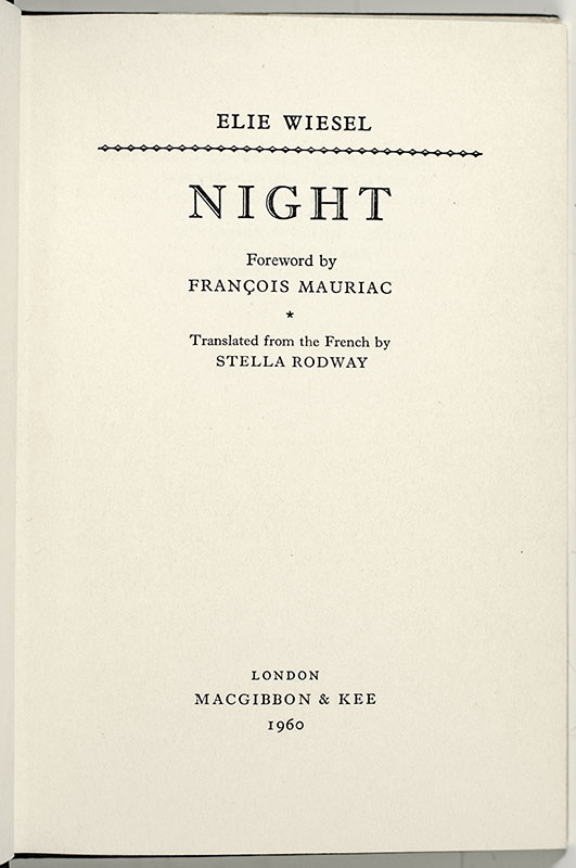 "The look in his eyes, as they stared into mine, has never left me": First Edition of Elie Wiesels Night; Signed by Him