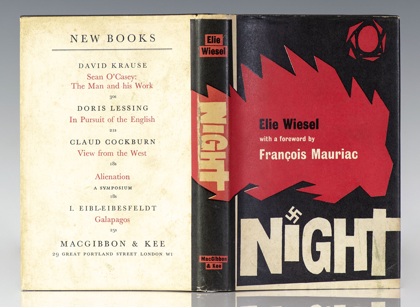 First English edition of Nobel laureate Wiesel’s masterpiece, which precedes the first American edition. Octavo, original cloth. Signed by Elie Wiesel on the front free endpaper. Near fine in a near fine dust jacket with light shelfwear. Jacket design by Cowan. Foreword by Francois Mauriac. Translated from the French by Stella Rodway. Housed in a custom half morocco clamshell box. Rare and desirable signed.
