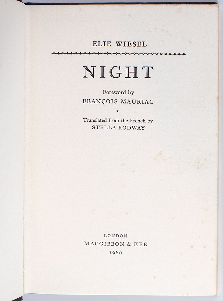 "The look in his eyes, as they stared into mine, has never left me": First Edition of Elie Wiesels Night; Signed by Him