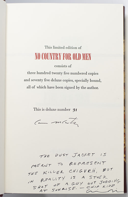 "The dust jacket is meant to represent the killer Chigurh, but in reality is a stock shot of a guy out jogging at sunrise": SIGNED limited First Edition of Cormac McCarthy’s No Country For Old Men; One of only 75 Copies and signed by Chip Kidd