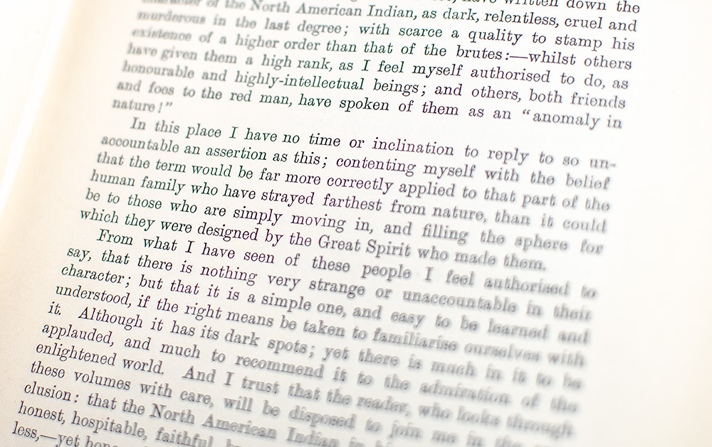 First Grant edition of this detailed anthropological history. Royal octavo, 2 volumes, original publisher's cloth with elaborately stamped in gilt, with 320 illustrations carefully engraved from the author's original paintings. In very good condition with some light rubbing to the extremities, light toning to the endpapers. An exceptional example with bright gilt decoration. Accompanied by an official Four Centuries of American Art First Day of Issue envelope featuring the author and Thomas Moran from 1998 and a card from the collection of Northern Natural Gas Company featuring a portrait of Mandan Chief, Four Bears, by Karl Bodmer.