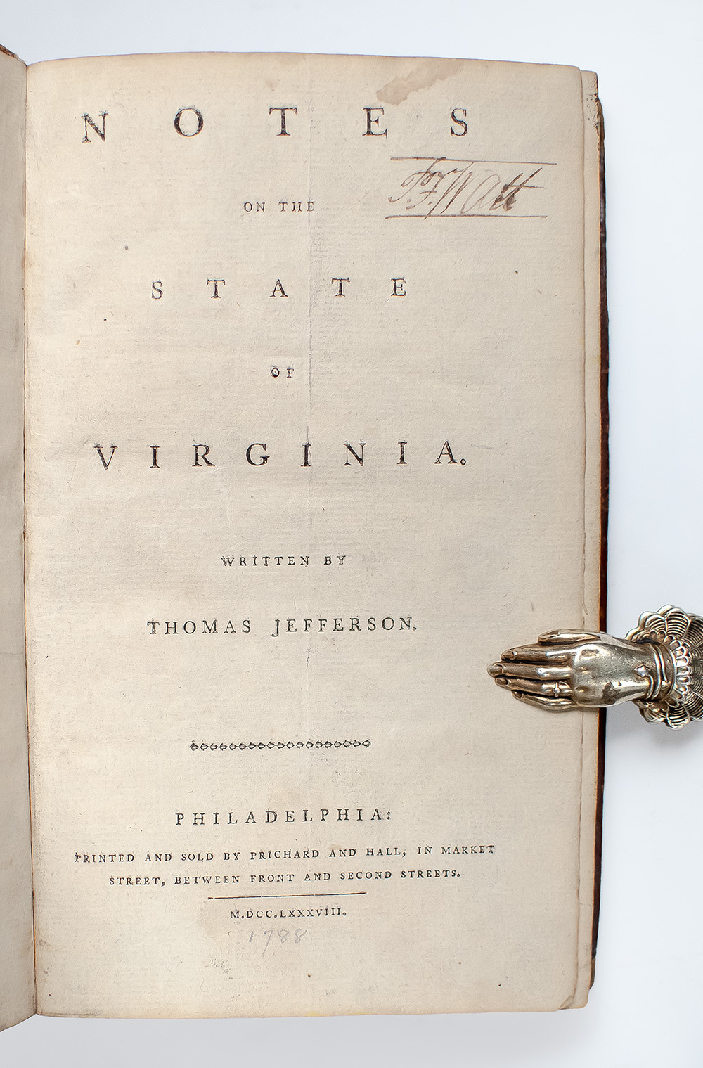 Widely considered the most important book published in America before 1800, Notes on the State of Virginia is both a compilation of data by Jefferson about the state's natural resources and economy, and his vigorous argument about the nature of the good society, which he believed was incarnated by Virginia. He expressed his beliefs in the separation of church and state, constitutional government, checks and balances, and individual liberty and wrote extensively about slavery, the problems of miscegenation, a justification of white supremacy, and his belief that whites and blacks could not live together in a free society. Jefferson initially had only 200 copies of Notes of the State of Virginia printed in Paris and published anonymously for private distribution, but due to high demand, it was soon reproduced in various inferior and inaccurately pirated editions. He was soon forced to release authorized editions in French and English in 1786 and 1787, respectively, and the present edition in 1788 which was preceded by the first English edition printed in London. "During his long and productive life Thomas Jefferson wrote and published only one full-length book. ... Though he gave it a misleadingly modest title and was originally reluctant to publish it at all, the Notes on Virginia was eventually accepted as an important contribution to American letters and science, and it is recognized today as the best single statement of Jefferson's principles, the best reflection of his wide-ranging tastes and talents. It is, in short, an American classic" (Peden, p. v).
