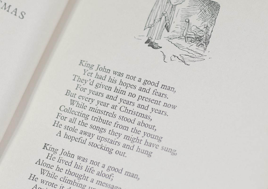 “Although Alan Alexander Milne wrote novels, short stories, poetry and many plays for adults, in addition to his work as assistant editor for Punch from 1906 to 1914, it is his writings for children that have captured the hearts of millions of people worldwide and granted Milne everlasting fame” (Silvey, 461). Milne wrote most of these poems at the request of friend and fellow poet Rose Fyleman, who was planning a new children’s magazine. “On a rain-blighted holiday in Wales, [Milne] escaped from the crowd of fellow guests to the summerhouse, and for 11 days wrote a set of children’s verses, one each day… ‘There on the other side of the lawn was a child with whom I had lived for three years [his son, Christopher Robin]… and here within me were unforgettable memories of my own childhood.’ He added more verses when he got home, enough for a book, and allowed some to be published in advance in Punch” (Carpenter & Prichard, 351). Shepard, a Punch staff artist at the time, provided delightful line vignettes, resulting in “a wonderful marriage of verse and vision. His delicately precise and fresh drawings had an instant appeal” (DNB).
