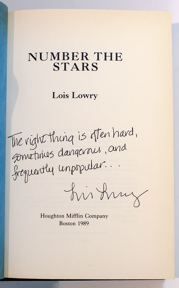“The right thing is often hard, sometimes dangerous, and frequently unpopular": First edition of Number the Stars; Lengthily signed by Lois Lowry