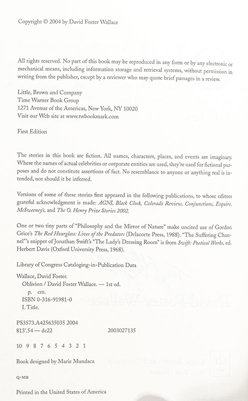“It's not that words or human language stop having any meaning or relevance after you die, by the way": First Edition of David Foster Wallace's Oblivion; Signed by Him
