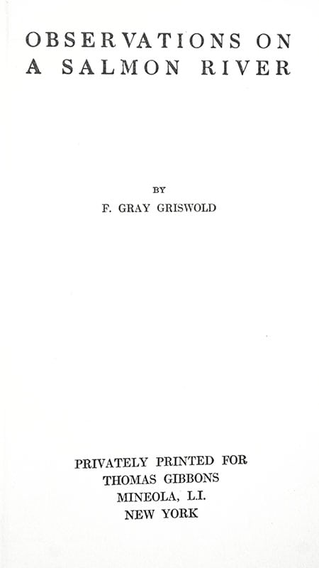 American author and sportsman Frank Gray Griswold authored dozens of books with a particular focus on salmon fishing, many printed privately and distributed among his personal friends. In Observations on a Salmon River, Griswold recounts his experiences fishing the waters of the Grand Cascapedia and its many tributaries and pools.