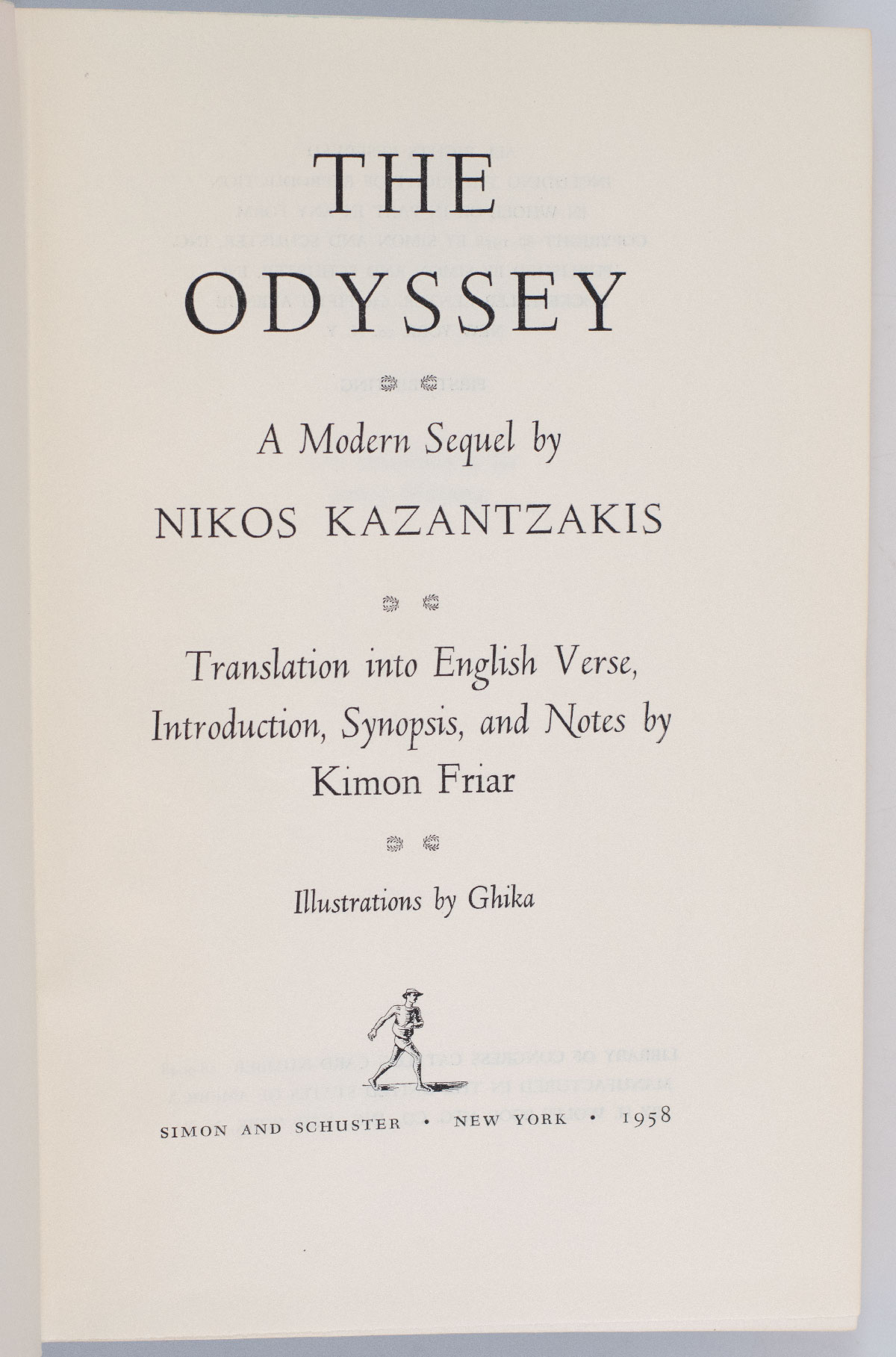 First edition of Kazantzakis' masterpiece. Octavo, original cloth. Translated into English by Kimon Friar; illustrations by Ghika. Fine in a near fine dust jacket. An exceptional example.