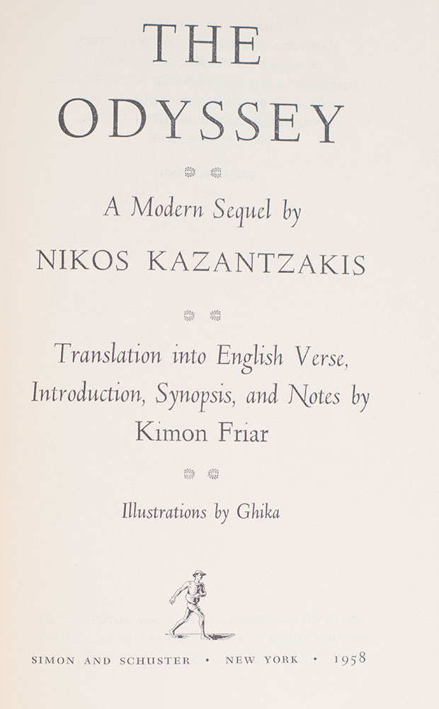 Nikos Kazantzakis began work on his modern sequel to Homer's Odyssey in 1924, publishing it in 1938 after drafting seven different versions. Kazantzakis considered this his most important work. Following the structure of Homer's Odyssey, it is divided into 24 rhapsodies, consisting of 33,333 17-syllable lines. It was translated into English in 1958 as The Odyssey: A Modern Sequel. “It has been a superhuman effort to record his immense spiritual experience" (Pantelis Prevelakis).