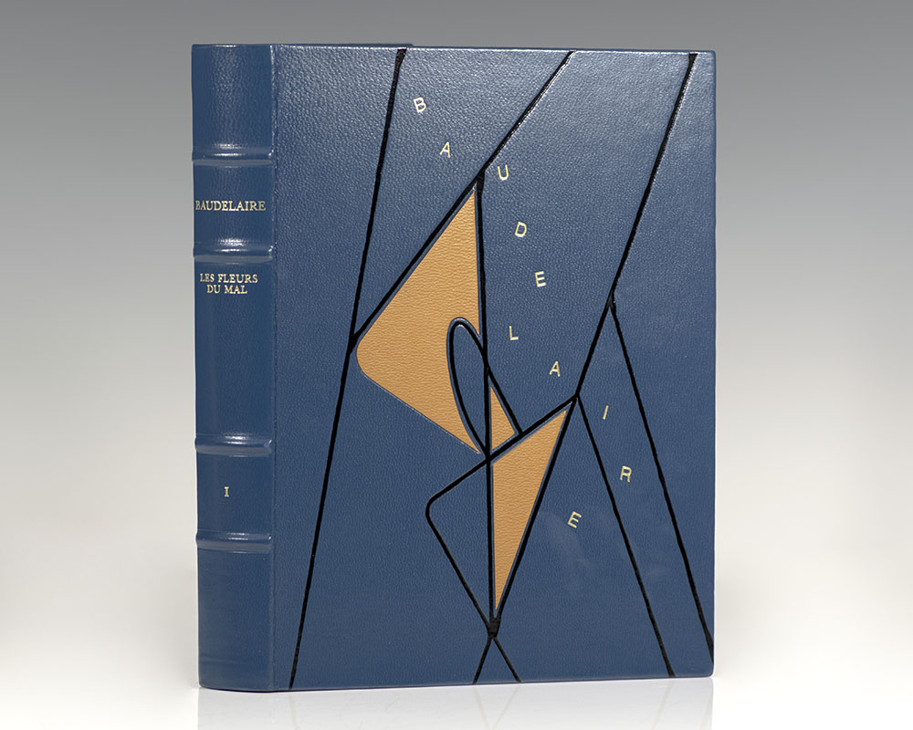 The Andre Sauret deluxe limited illustrated edition of the works of Charles Baudelaire. Quartos, 4 volumes, bound in full blue morocco with gilt titles and tooling to the spine, marbled endpapers, top edge gilt, with ten original lithographic illustrations in color per volume. In fine condition. Each volume housed in the original marbled slipcase.