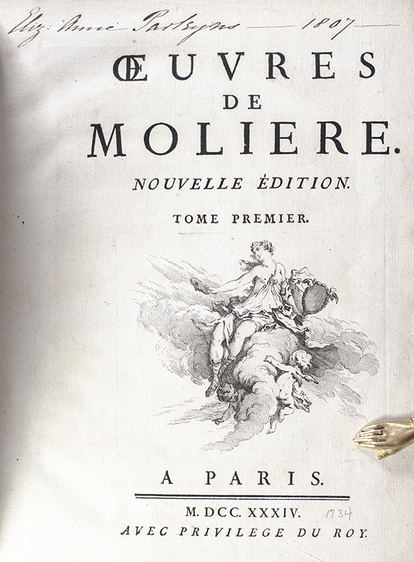 First edition, first issue of one of the greatest French illustrated books of the first half of the eighteenth century. First issue with "Comteese" in vol. VI, p. 360, line 12. Quarto, six volumes bound in full calf with gilt titles and ruling to the spine in six compartments within raised bands, morocco spine labels lettered in gilt. Illustrated with 33 engraved plates by Laurent Cars after François Boucher, engraved frontispiece portrait of Molière by Nicolas-Bernard Lépicié after Charles-Antoine Coypel, 210 engraved head and tailpieces, and 104 engraved initials by Joullain and Cars after Boucher, Blondel and Oppenord. In near fine condition. Rebacked by MacDonald. From the library of Lady Elizabeth Anne Levinge (née Parkyns) with her bookplate and ownership signature to each volume. Additional bookplate to each volume. A very nice example of this brilliantly illustrated compendium of the works of the great French playwright.