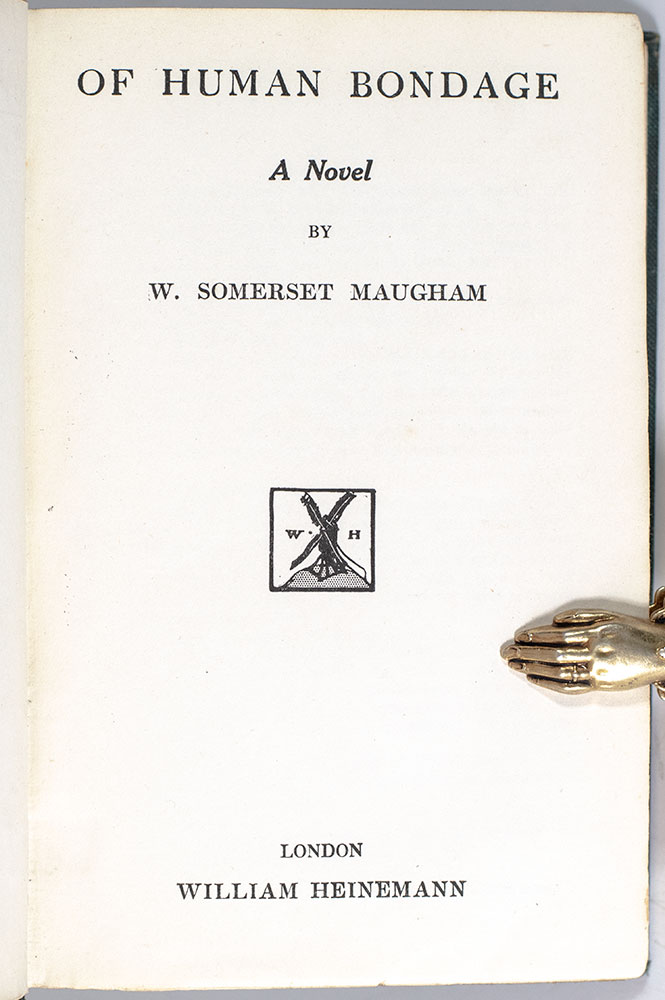 “Maugham’s longest and most ambitious novel, in which ‘fact and fiction are inextricably mixed,’ draws heavily upon the author’s own youth, with circumstances and names scarcely altered” (Parker, 63). “As early as 1911 [Maugham] had retired temporarily from the theatre to work on his long novel, Of Human Bondage. He was to correct the proofs under the admiring eyes of Desmond MacCarthy in a small hotel at Malo, near Dunkirk; the two men were drivers in an ambulance unit for which they had volunteered at the outbreak of war in 1914… Of Human Bondage was published in 1915. It was less noticed in wartime London than in New York, where Theodore Dreiser reviewed it with enthusiasm. It remains Maugham’s most impressive literary work, and by the time of his death [1965] was said to have sold ten million copies” (DNB). It was the basis for the 1934 film directed by John Cromwell starring Leslie Howard and Bette Davis.