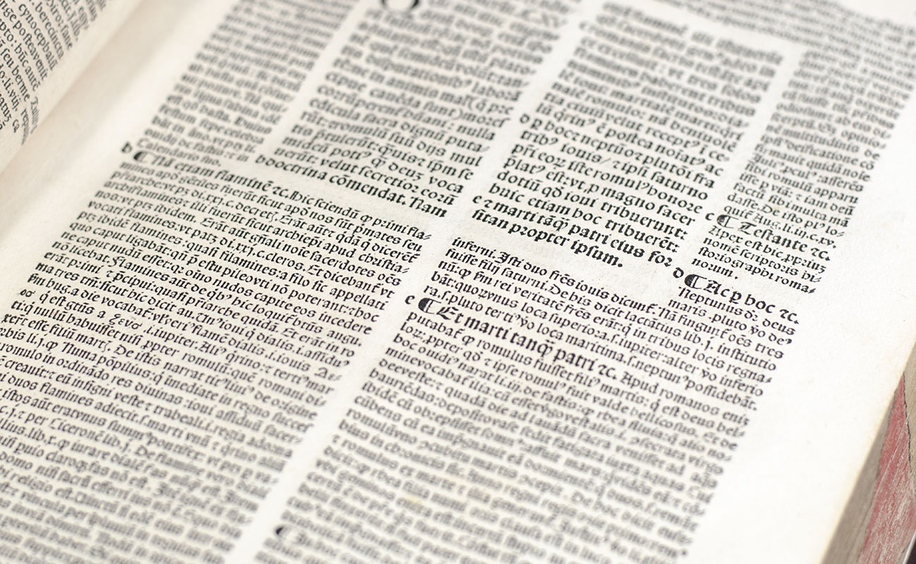 Rare 16th century Koberger edition of Augustine's monumental work. Folio, bound in full geometric blind-stamped calf with gilt titles to the spine and front panel, three raised tooled bands to the spine, hand painted geometric decoration to the fore-edge, title page printed in red and black with an elaborate central woodcut vignette of Saint Augustine at his writing desk within an elaborate architectural woodcut border, text in four columns. In very good condition.